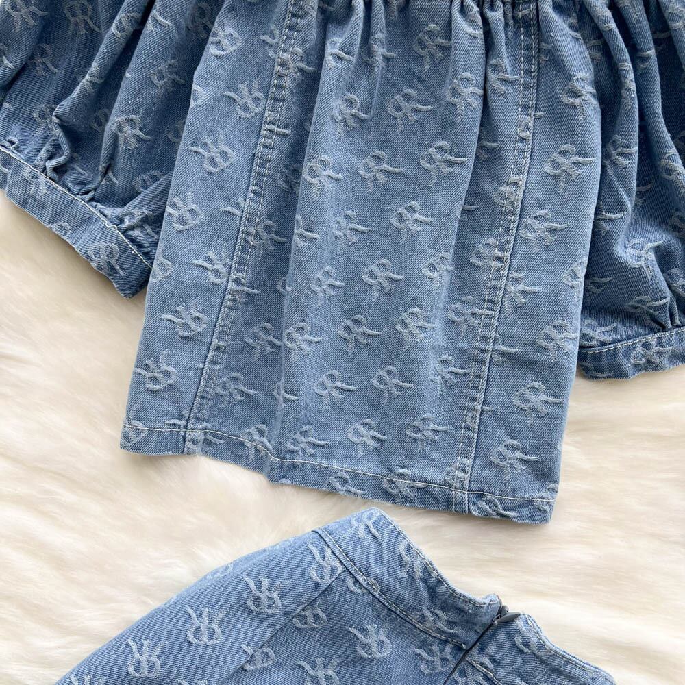 Retro Hong Kong style denim suit women's design sense niche short puff sleeve shirt wide leg shorts fashion two-piece suit ショート レトロ ショーツ ブルマー ワイドレッグ ワイドパンツ lyxaj43404722631