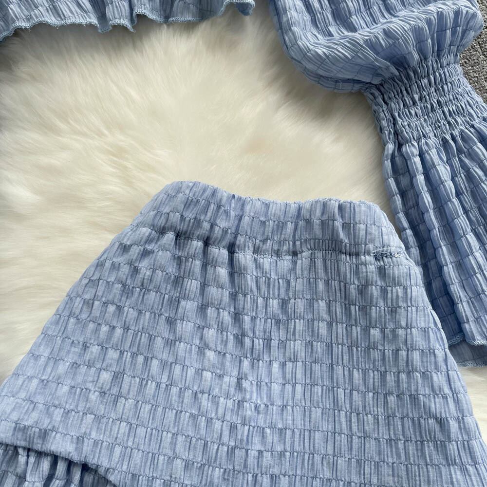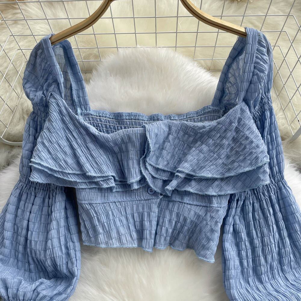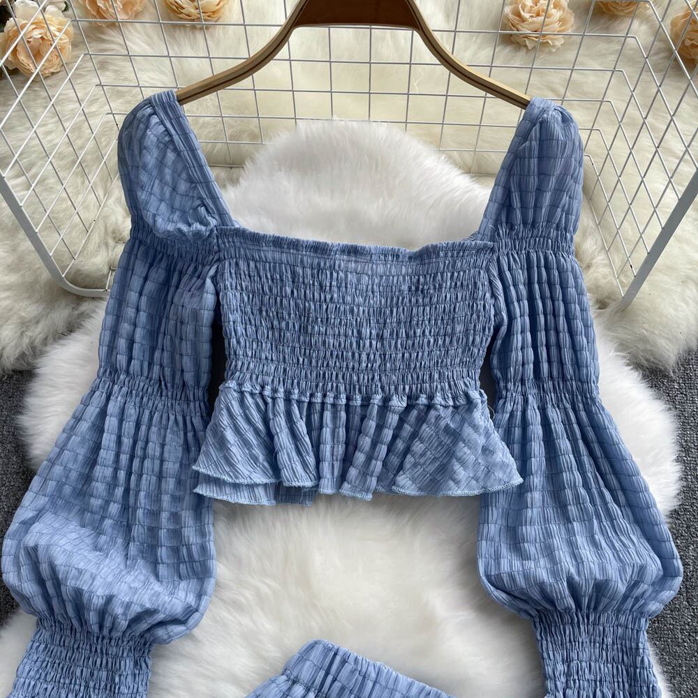 French niche design sense ruffled square collar bubble long-sleeved shirt suit women's high-waisted wide-leg shorts two-piece suit ロング ショーツ ブルマー スクウェア lyxaj52994992880