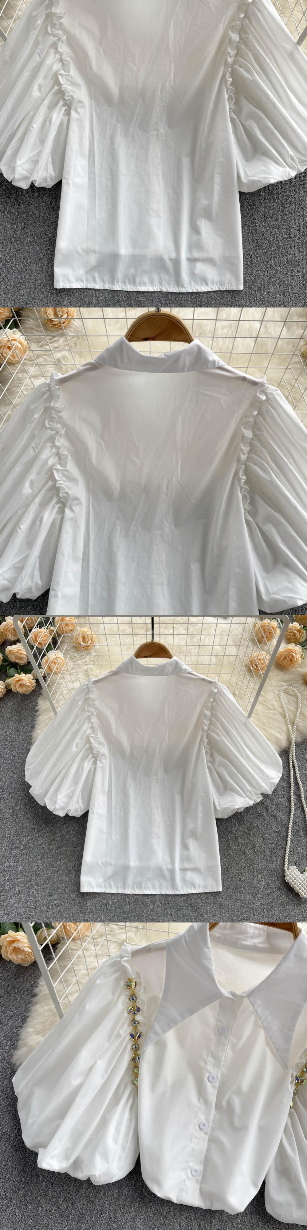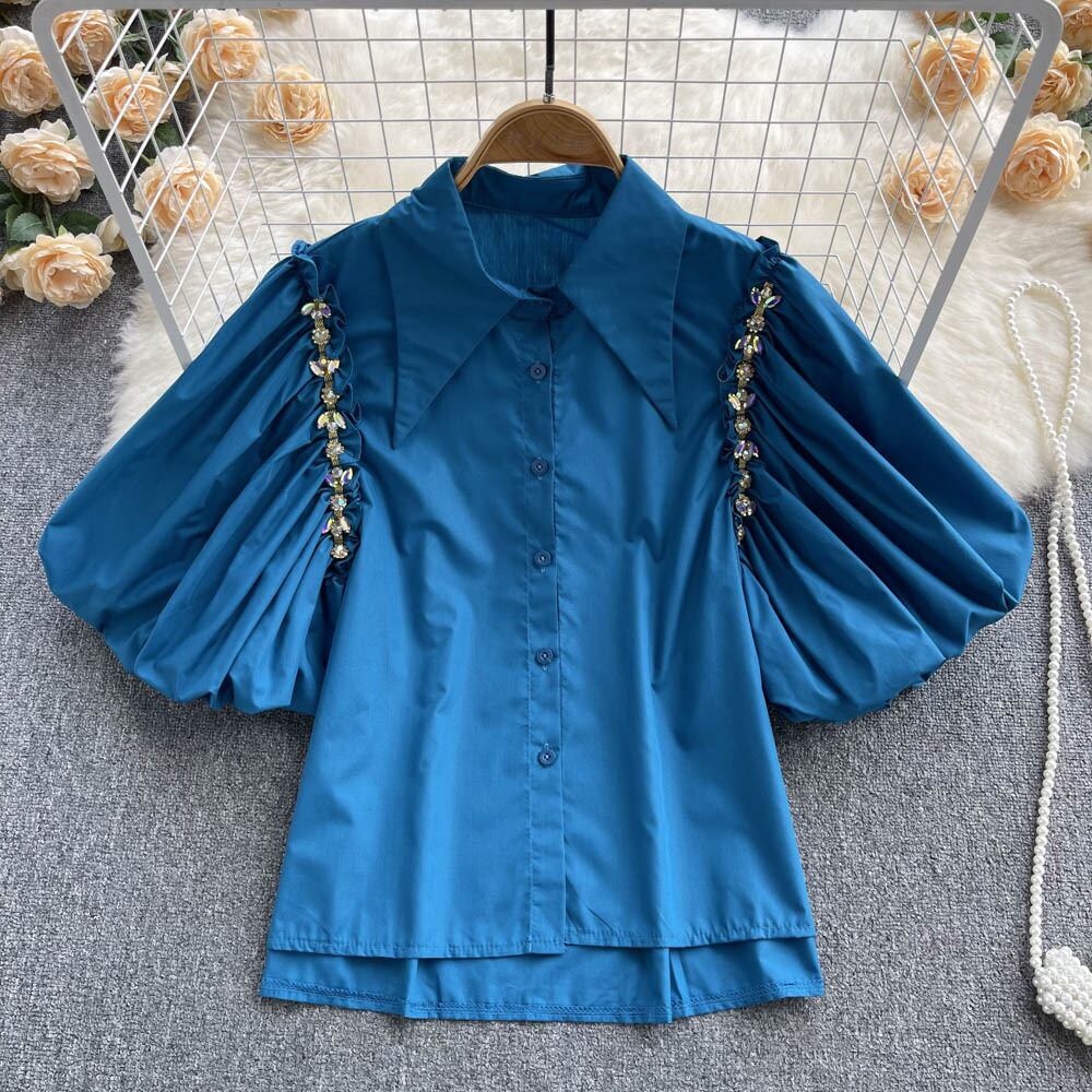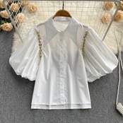 French retro pleated puff sleeves heavy-duty diamond-studded chain decorated with irregular split design single-breasted shirt レトロ プリーツ チェーン lyxaj11496398153