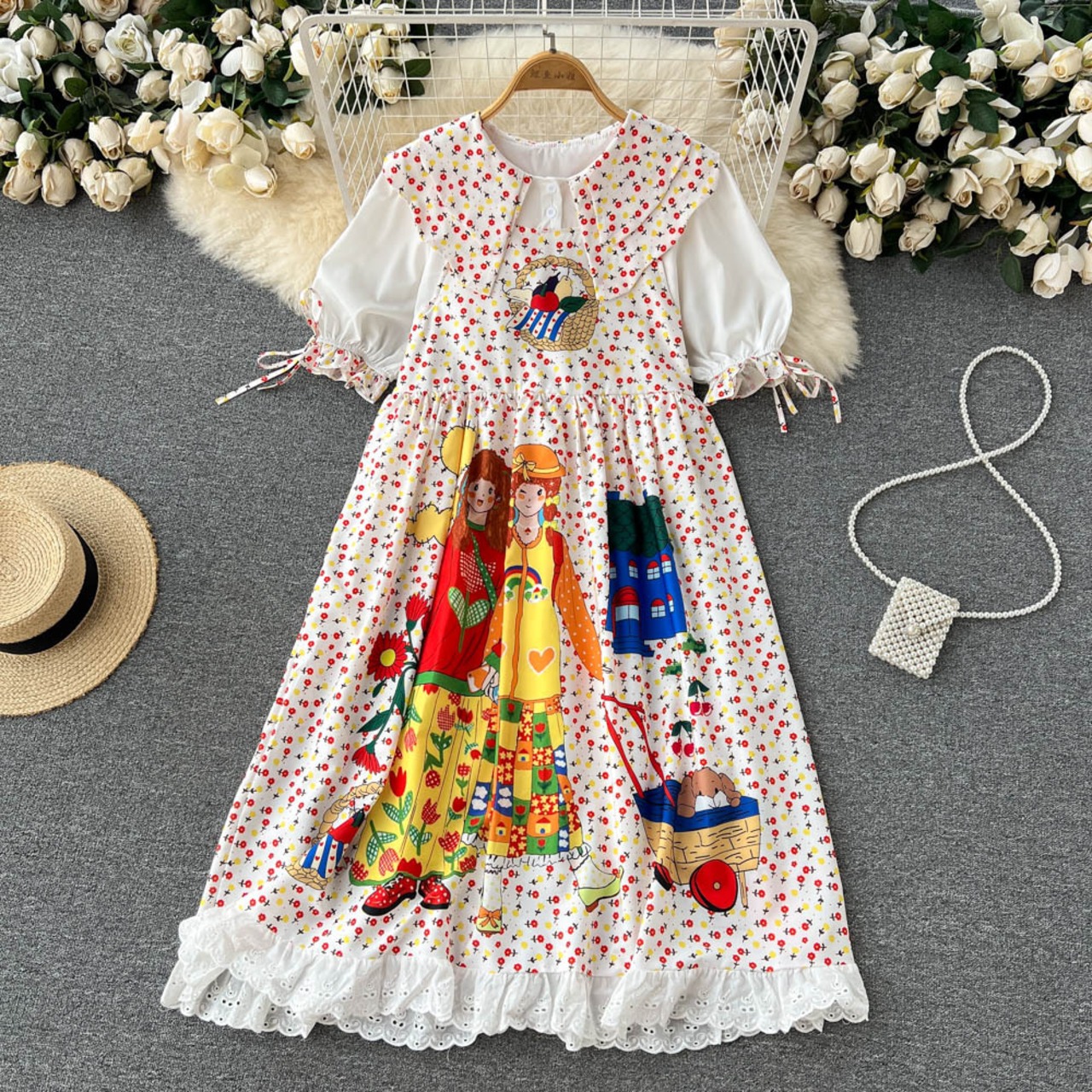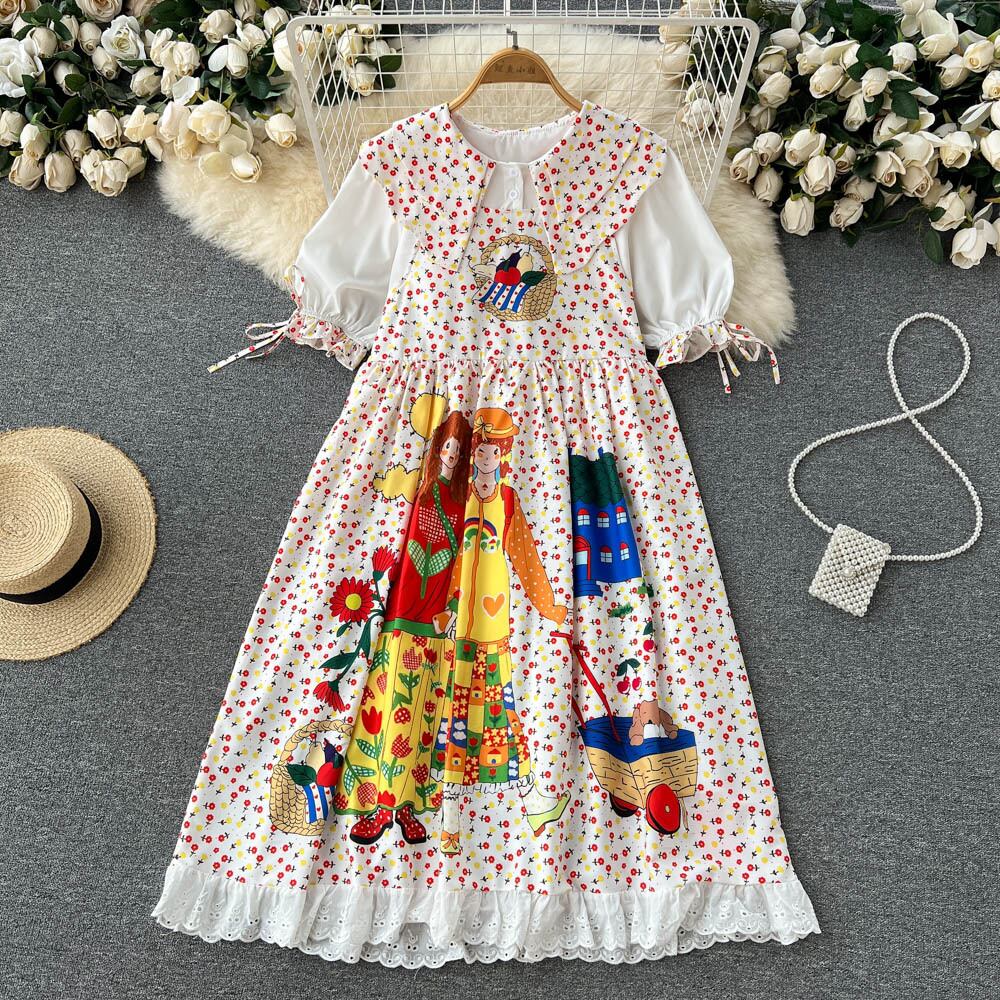 Large size age-reducing doll skirt niche design contrast color printing stitching Western-style puff sleeve dress summer women 大きめサイズ サマー 夏物 スカート ステッチ lyxaj17027804087