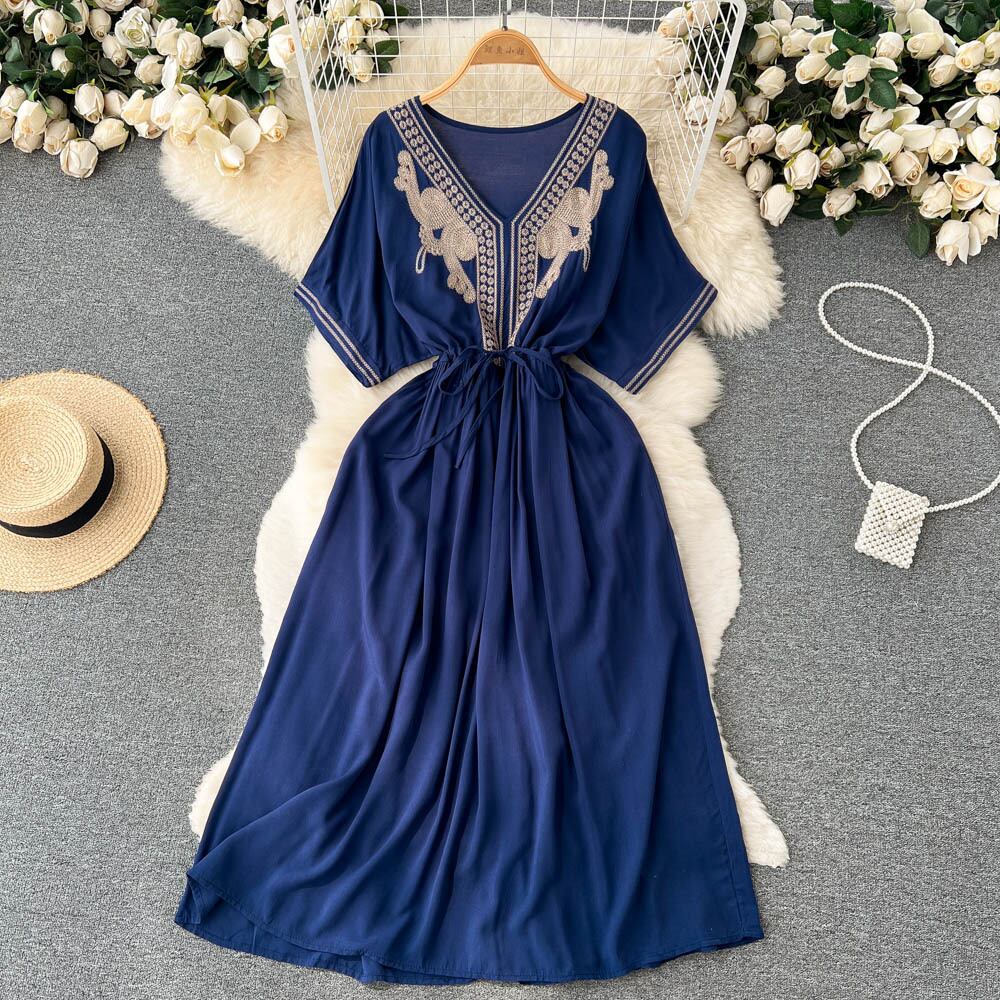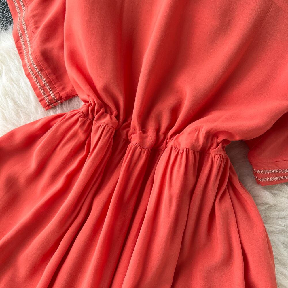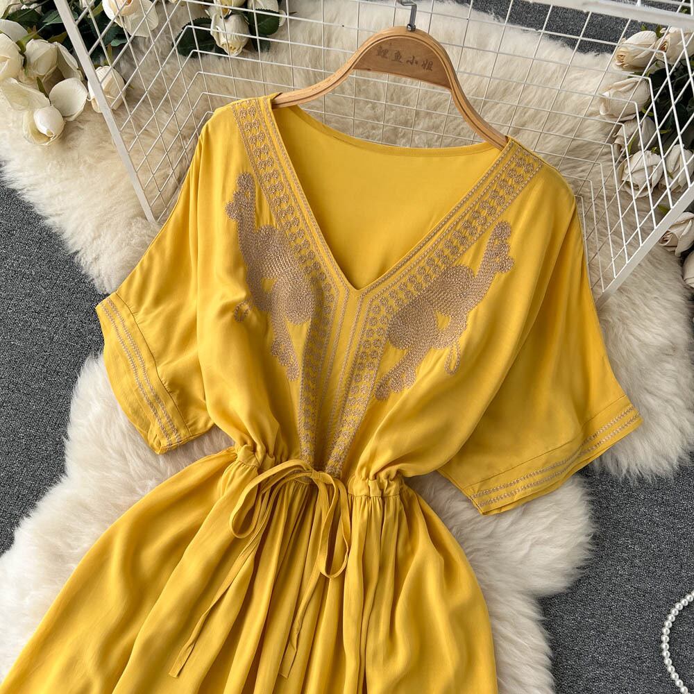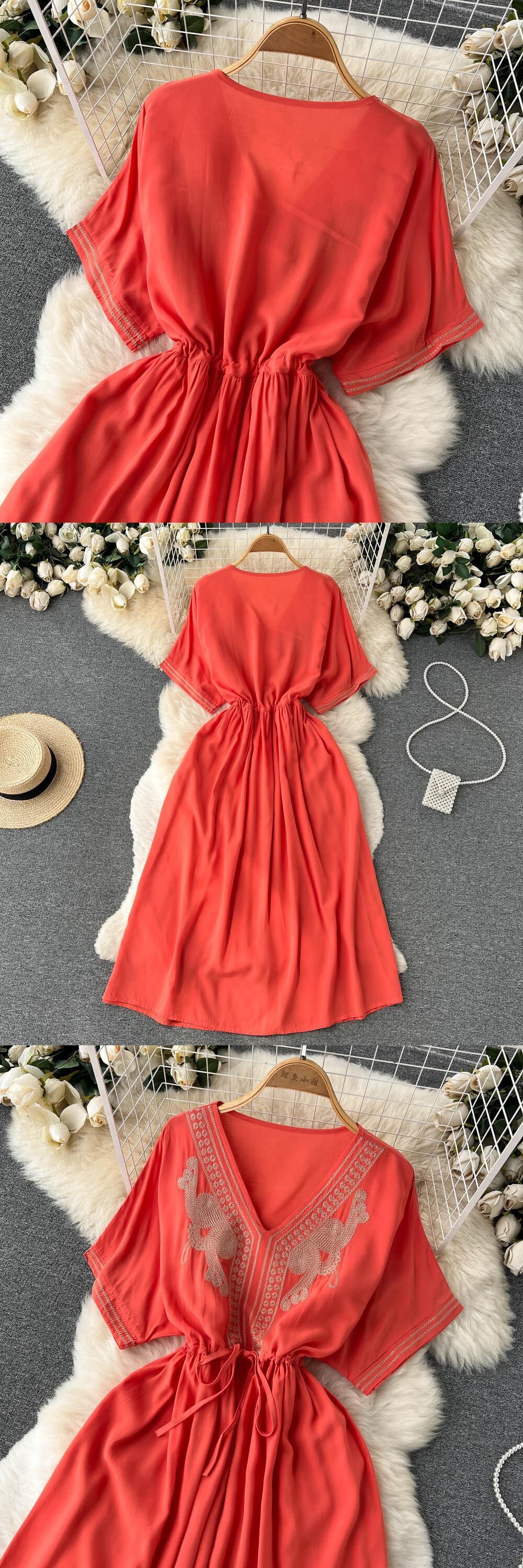 Light and familiar style, unique, drawstring waist, hook flower V-neck dress, summer women's French short-sleeved midi skirt サマー 夏物 スカート Vネック フラワーデザイン lyxaj7471963245