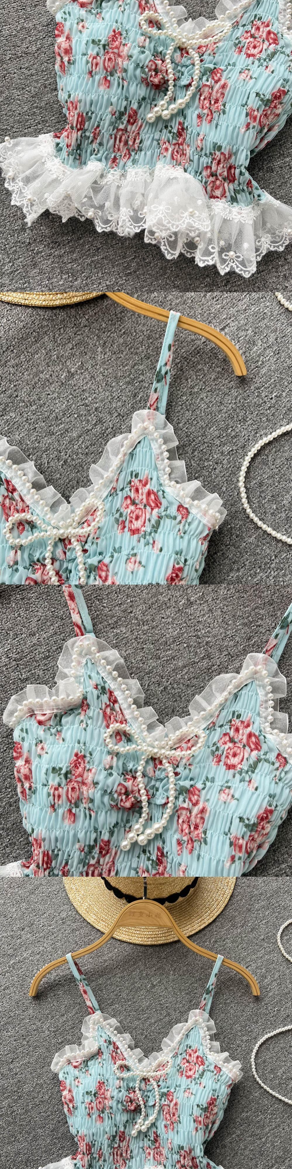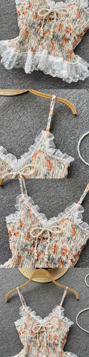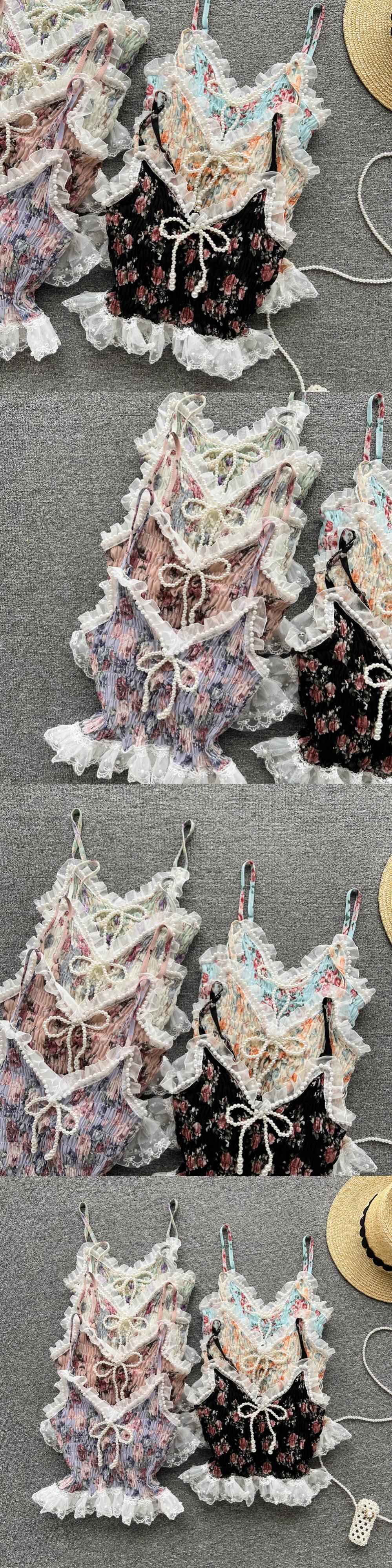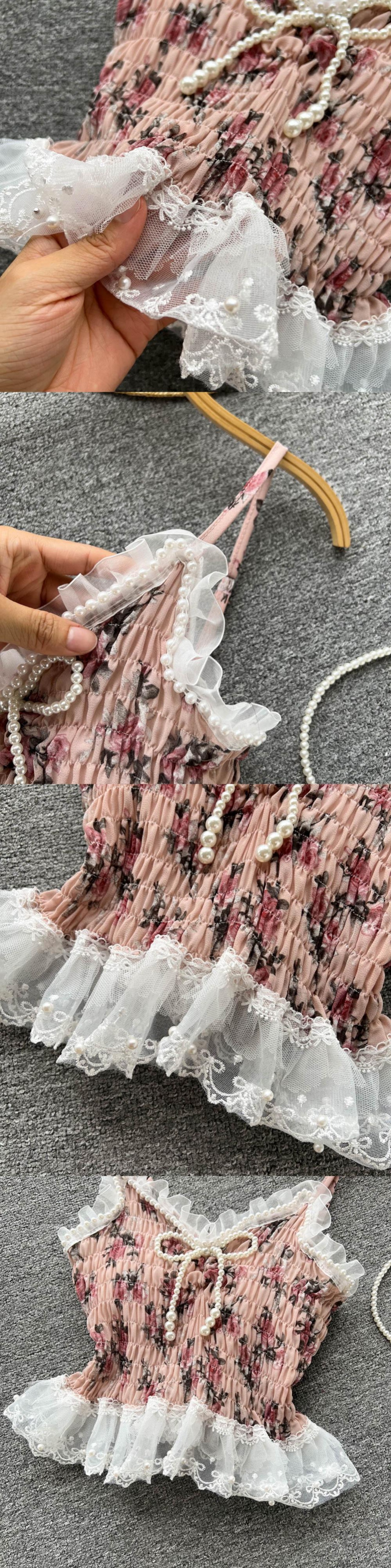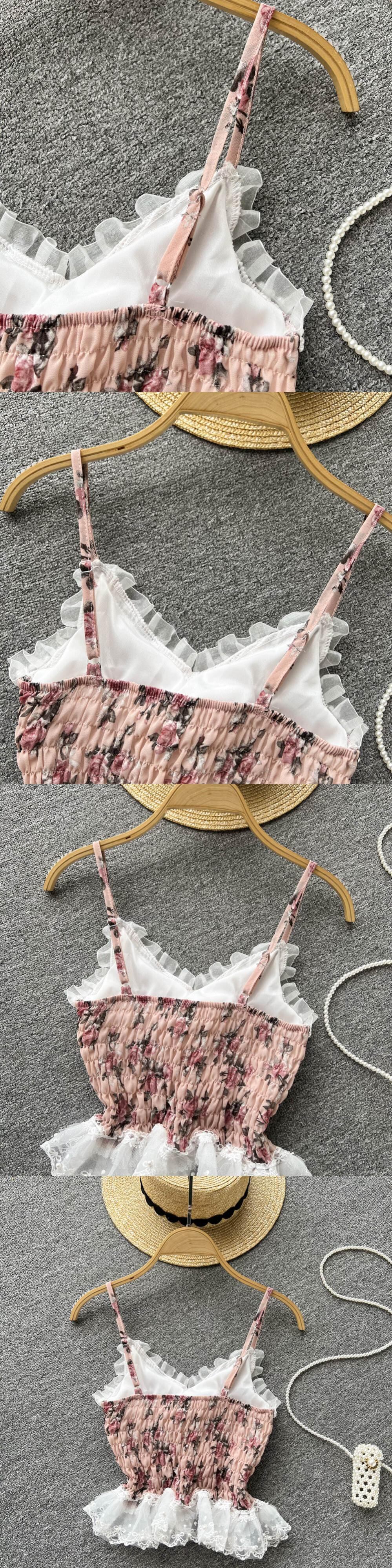 Pure desire, y feeling, heavy industry, wood ear, mesh, lace, bow, beaded, all-match, floral suspenders, small vest, trendy リボン レース メッシュ 花柄 lyxaj93194323573