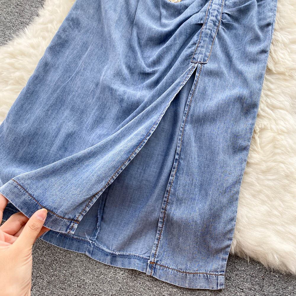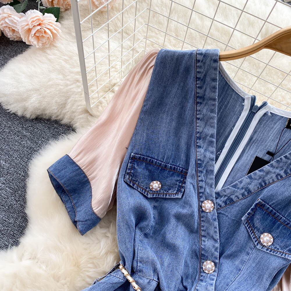 Light familiar style V-neck stitching puff sleeves denim dress women's French retro waist and thin A-line slit long skirt ロング レトロ スカート Vネック Aライン ステッチ lyxaj2848577475