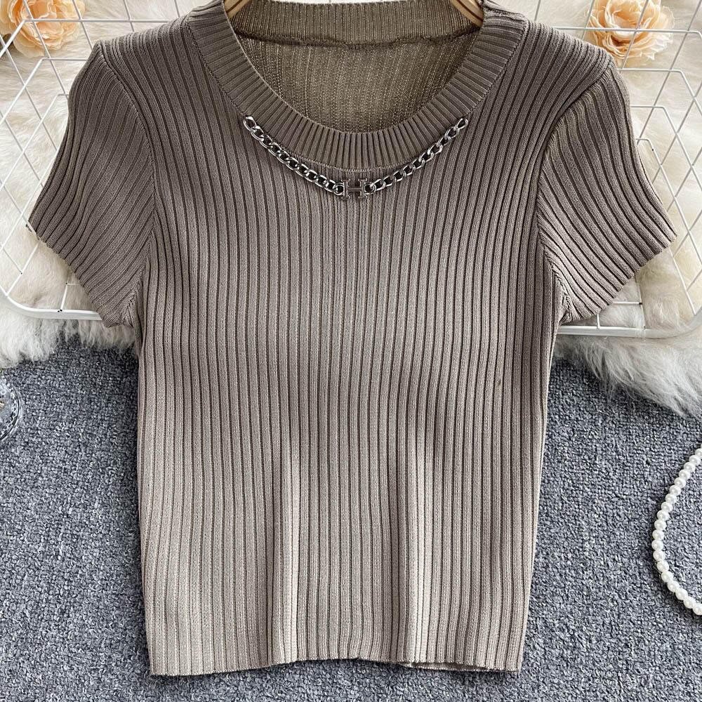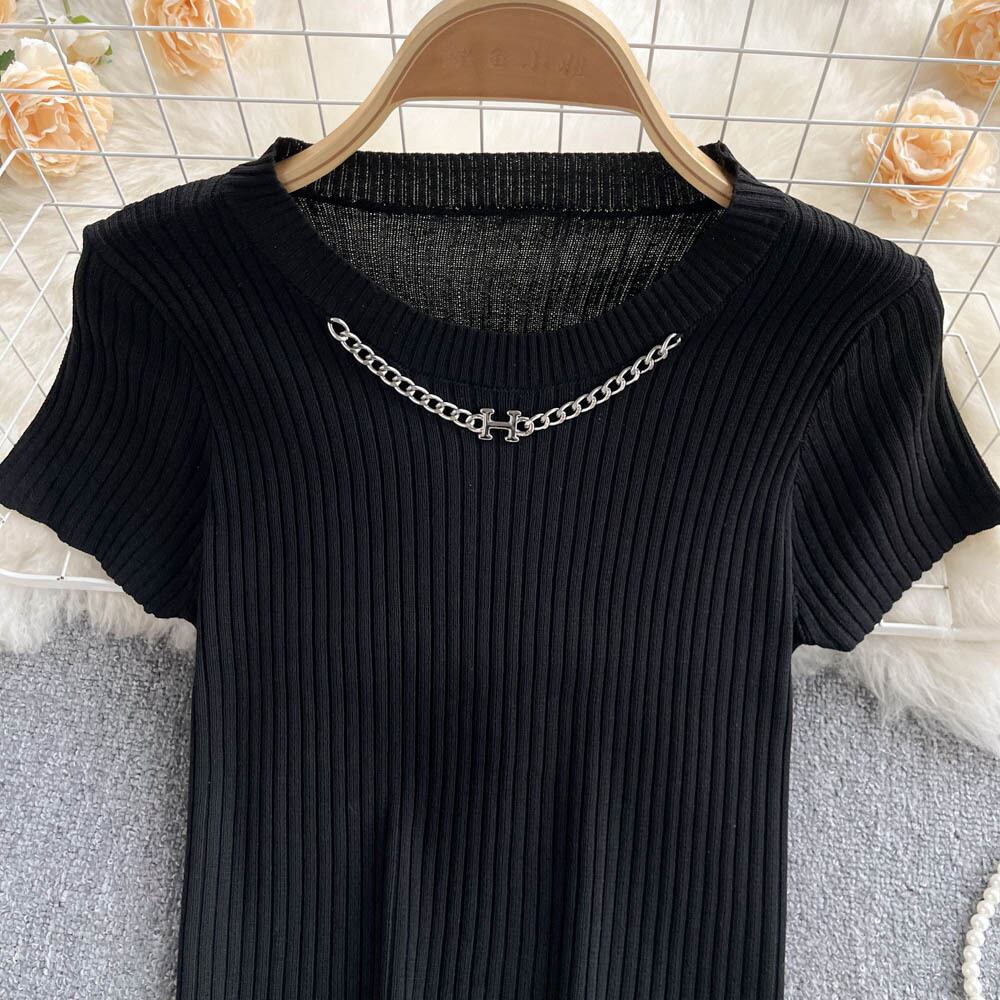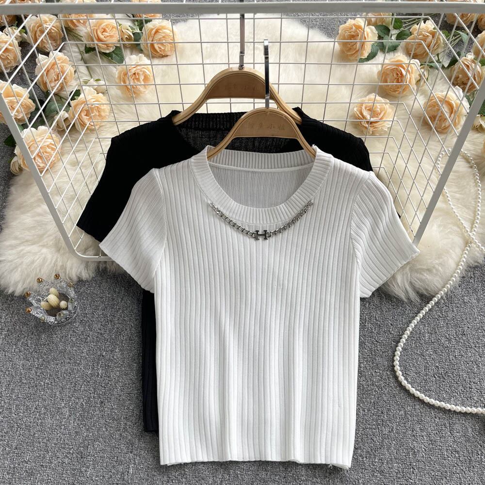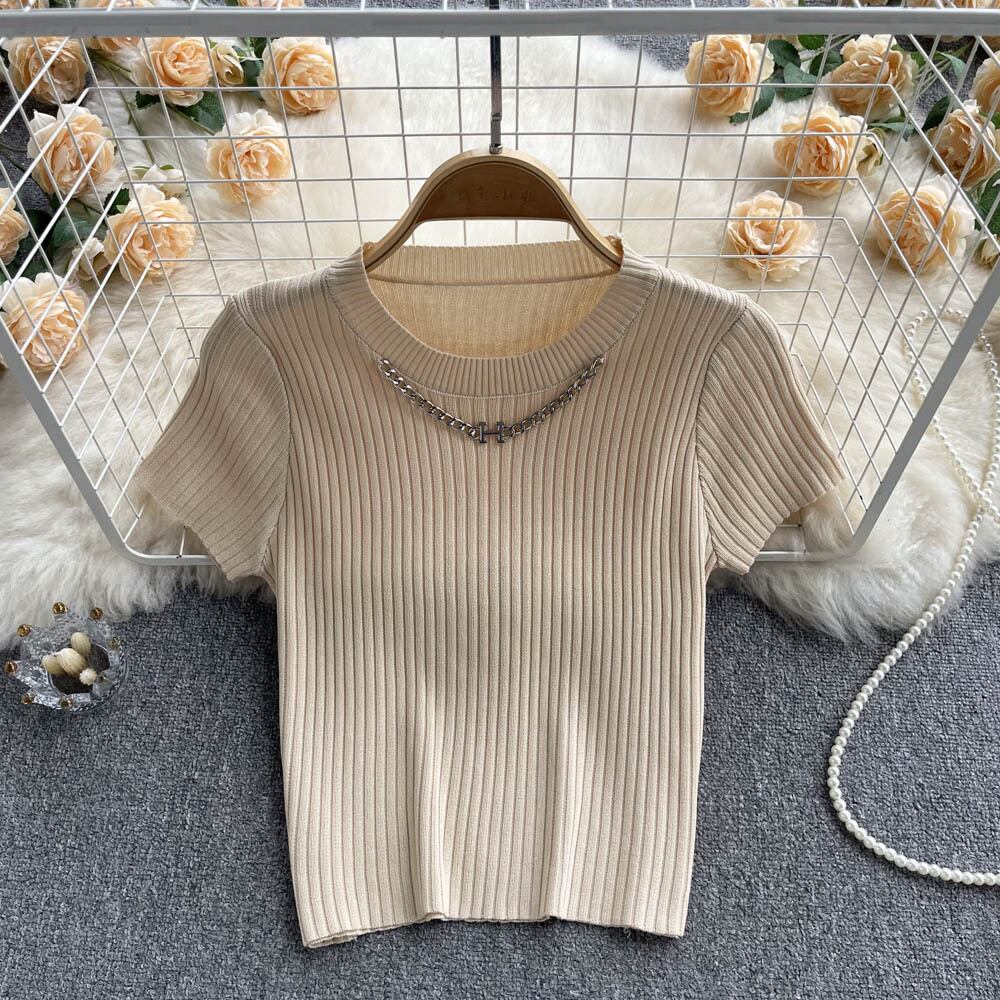 Dairy wear small knitted short t-shirt 2022 women's new slim short-sleeved T-shirt fashionable shoulder top ショート スリム Tシャツ lyxaj30880816358