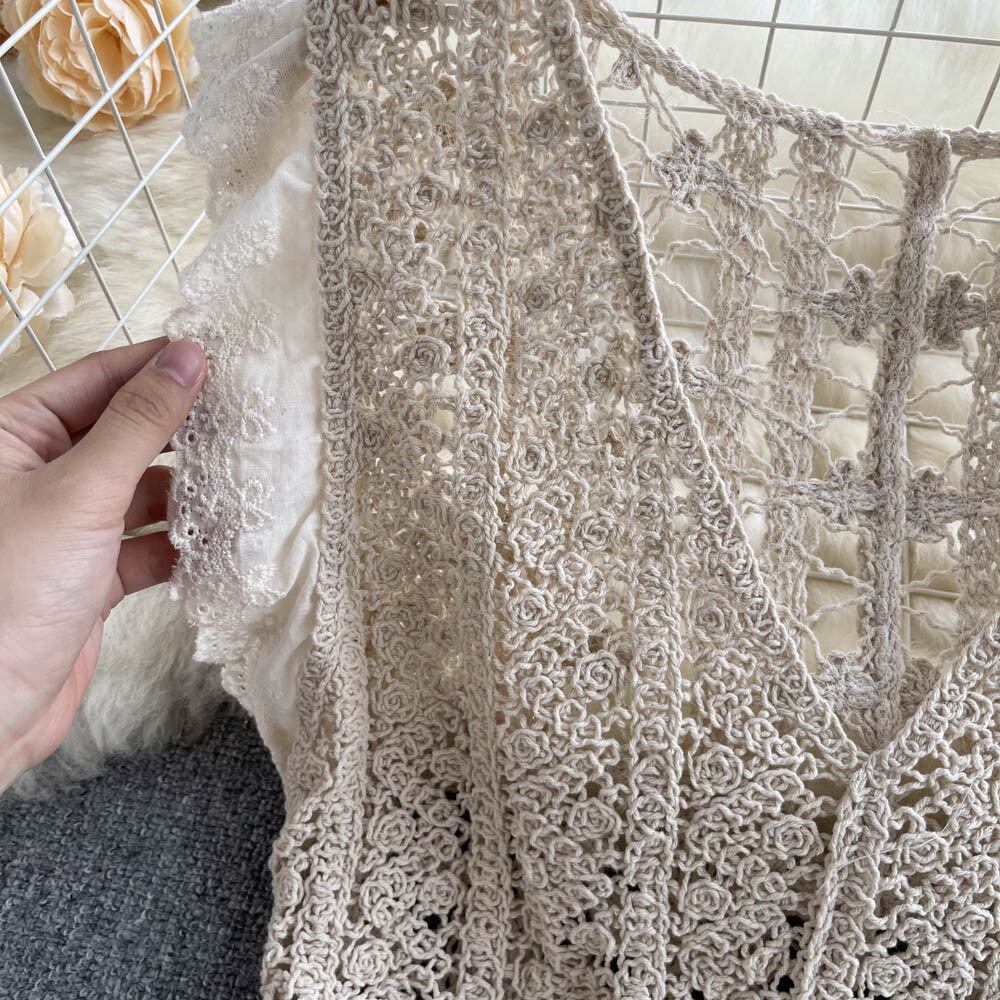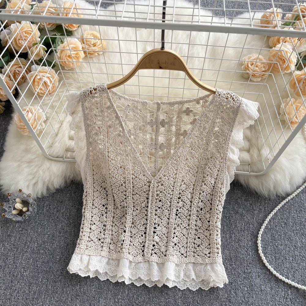 Hollow knitted blouse top loose retro lace all-match small shawl short vest sleeveless V-neck vest women ショート レトロ レース ブラウス ノースリーブ Vネック lyxaj30604003913