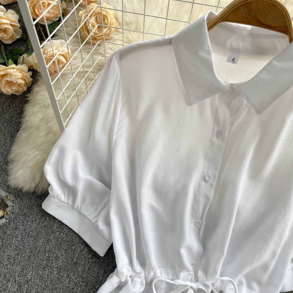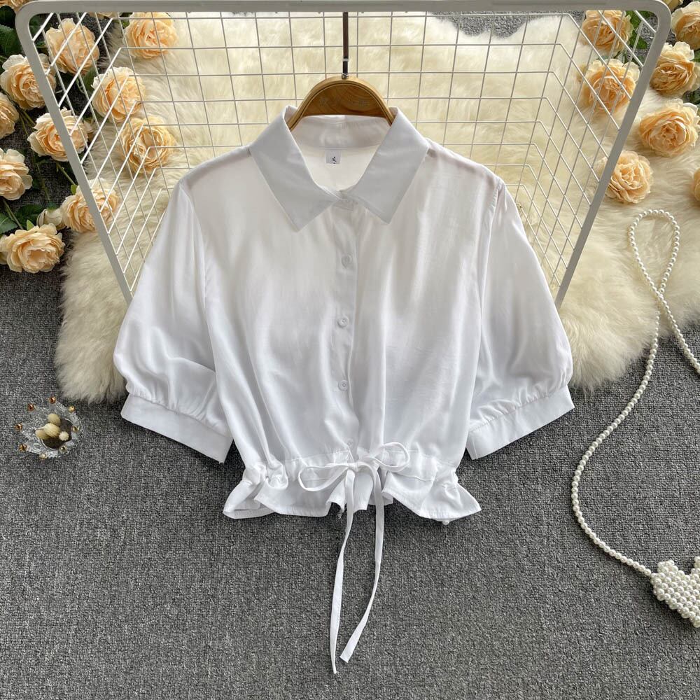 Solid color simple lapel shirt women's design sense niche summer new retro drawstring short-sleeved shirt women's top trend レトロ サマー 夏物 ソリッドカラー lyxaj79779908481