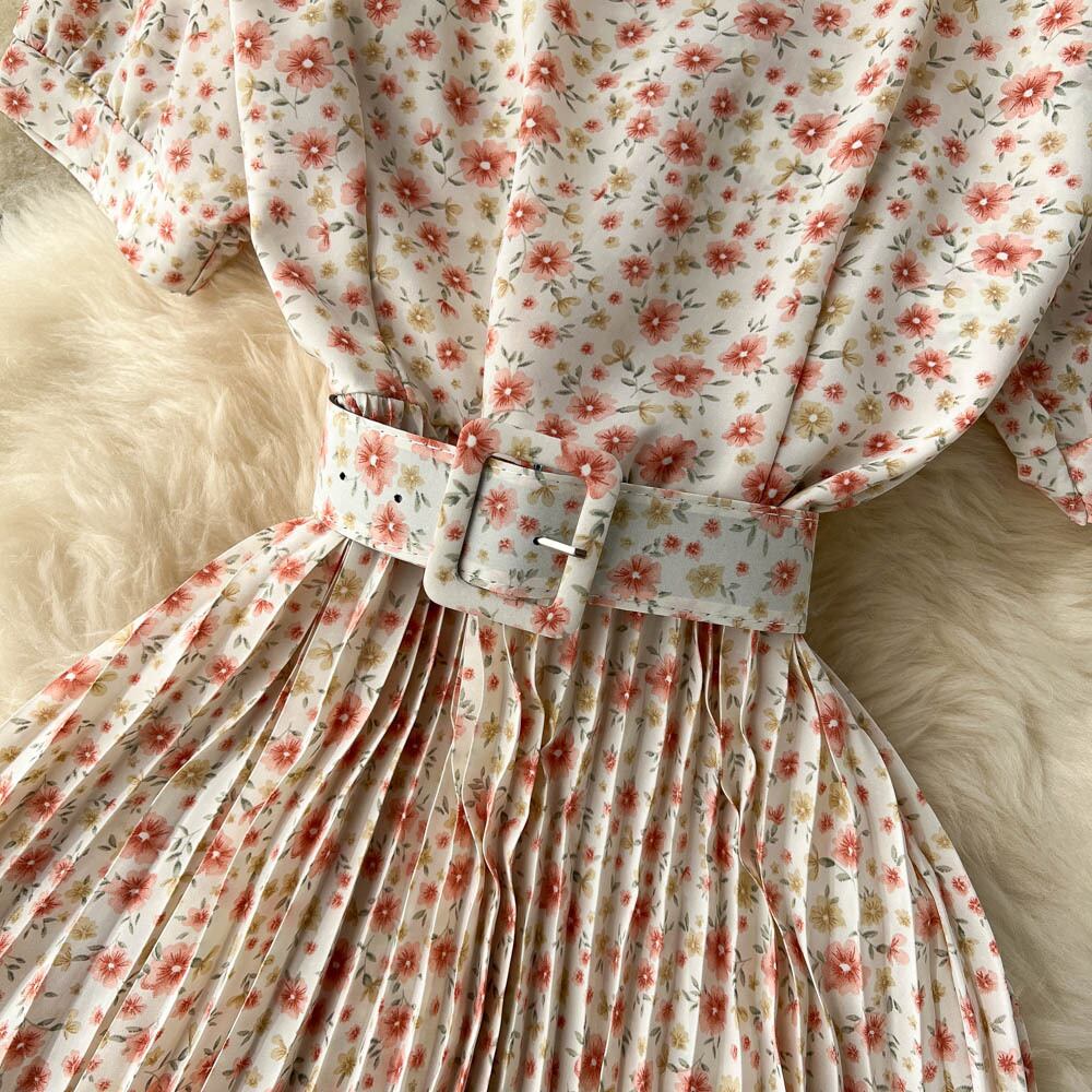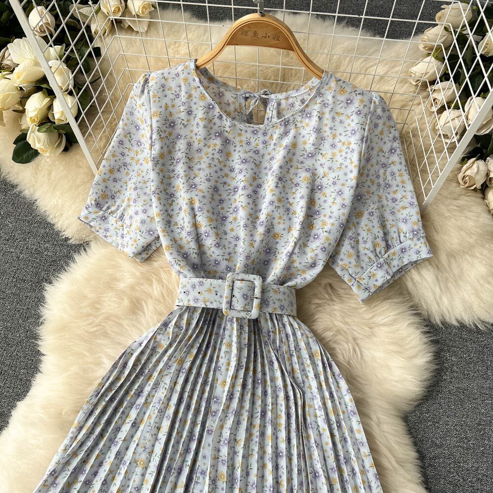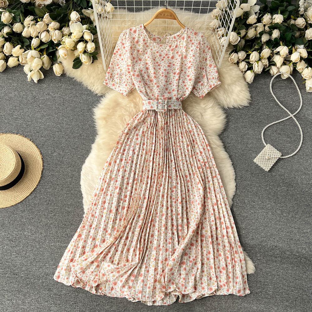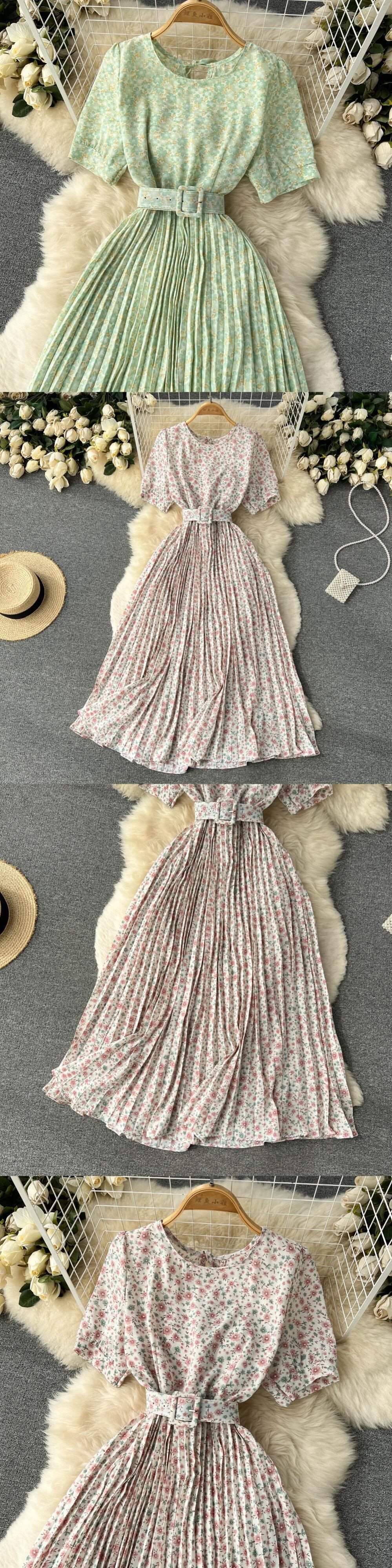 2022 summer new puff sleeves round neck elastic waist pink small floral pleated temperament waist slim dress ピンク エラスティック 伸縮 プリーツ サマー 夏物 花柄 Oネック スリム lyxaj9676224969