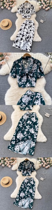 This year's popular beautiful two-piece suits women's summer style printed short shirts tops high waist split skirts trendy ハイウェスト ショート プリント シャツ サマー 夏物 スカート lyxaj78530522967