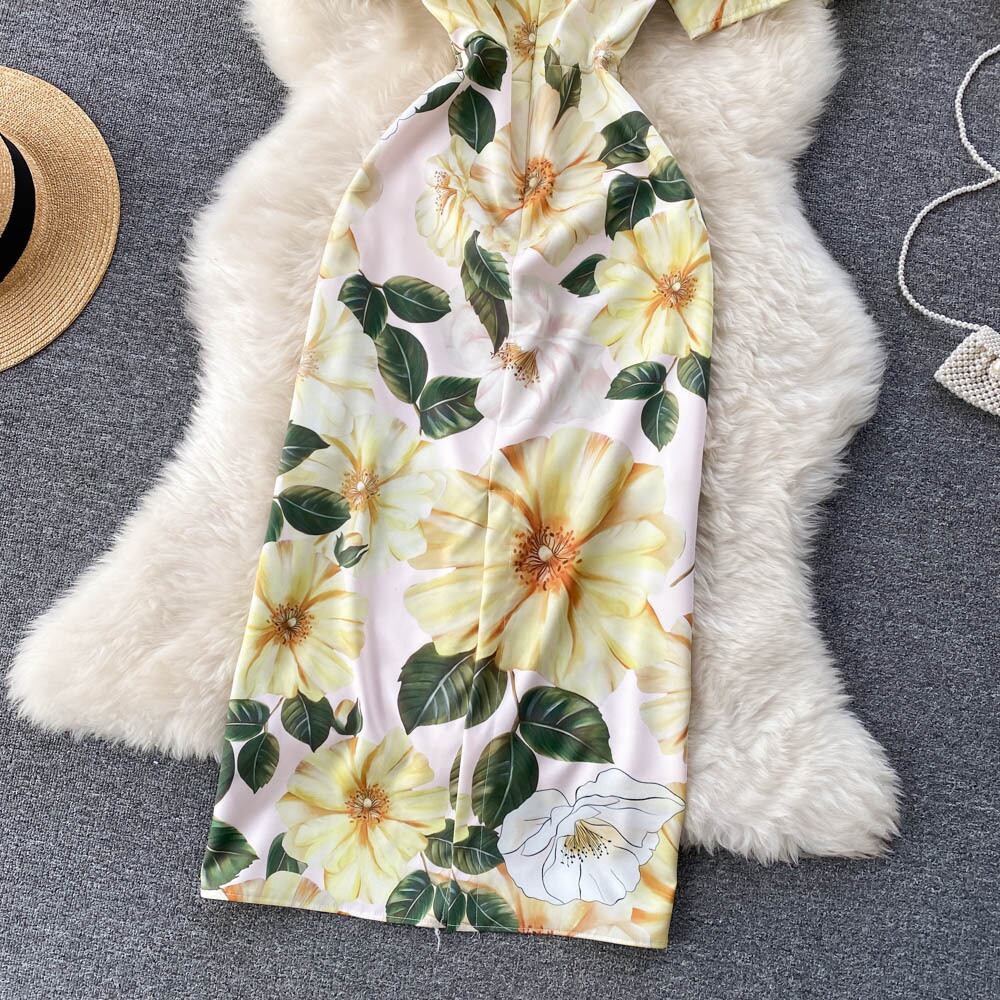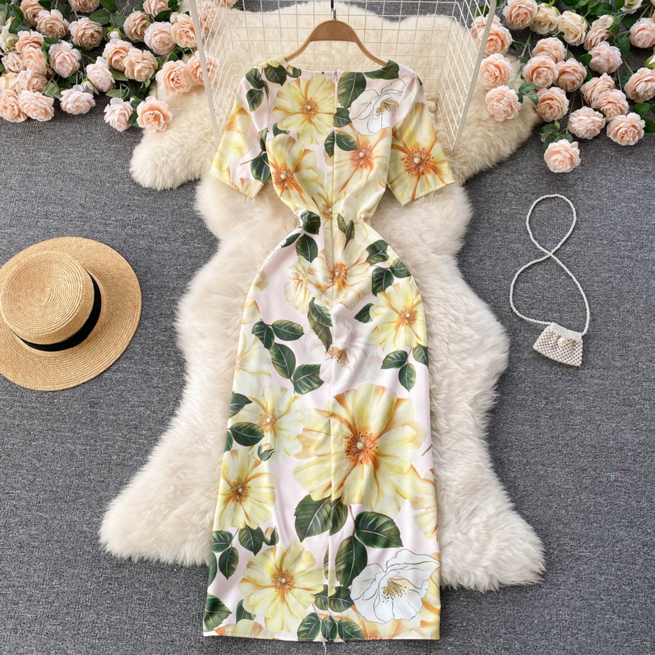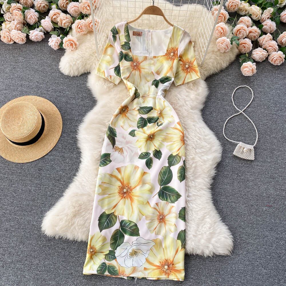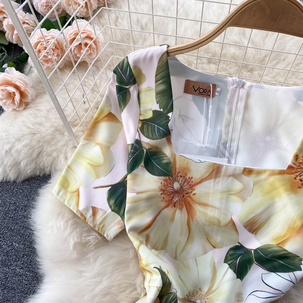 Square neck floral short-sleeved dress women's summer new style slimming lady temperament package hip A-line mid-length skirt サマー 夏物 花柄 スカート Aライン スクウェア lyxaj68136690526