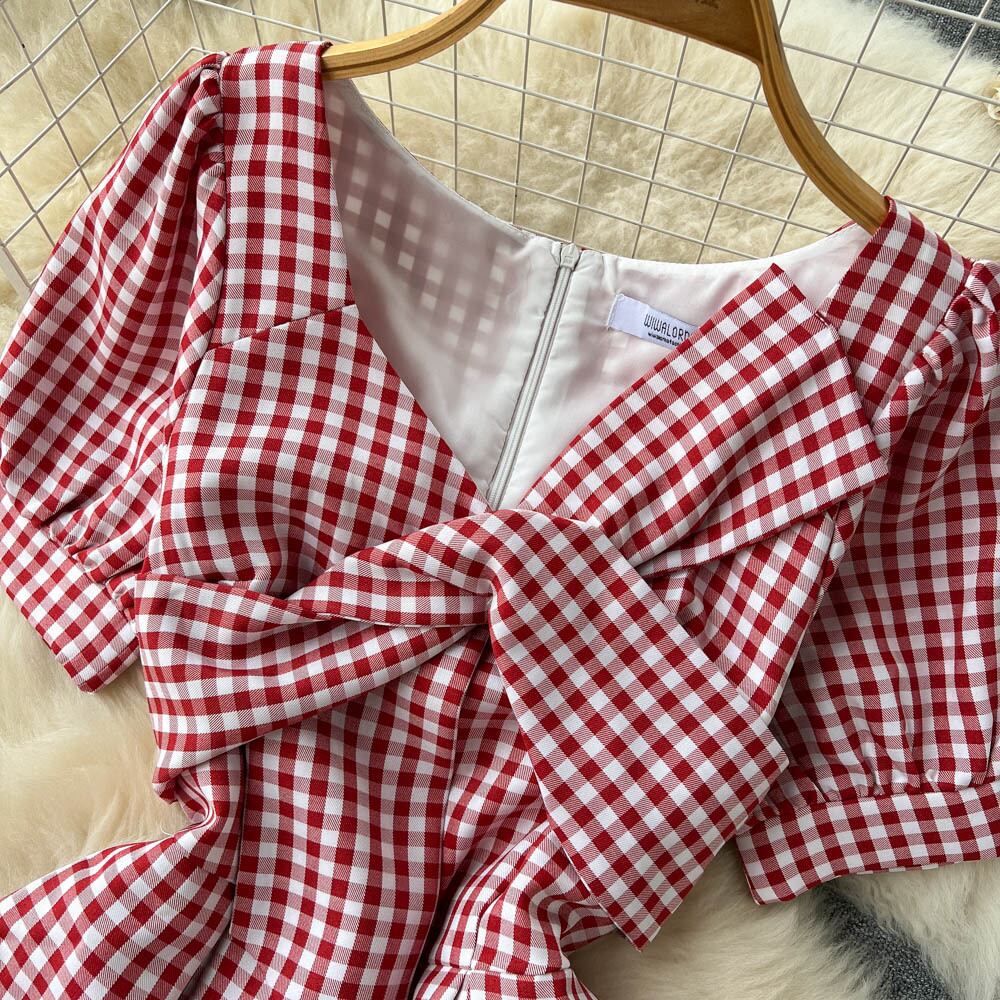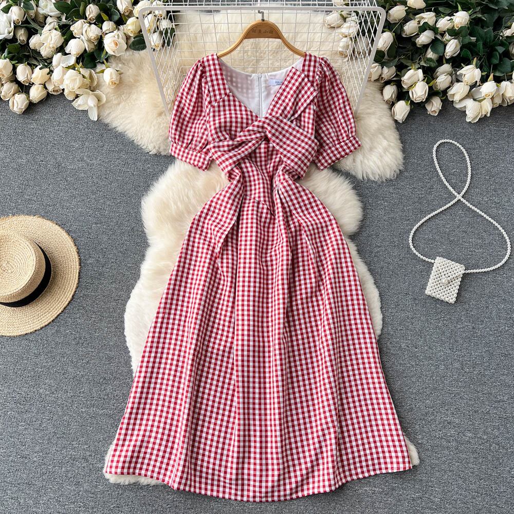 2022 summer new sweet first love tea break French plaid waist dress women's puff sleeve A-line skirt 大人ガーリー スウィート キュート カジュアル サマー 夏物 スカート Aライン lyxaj72377482665