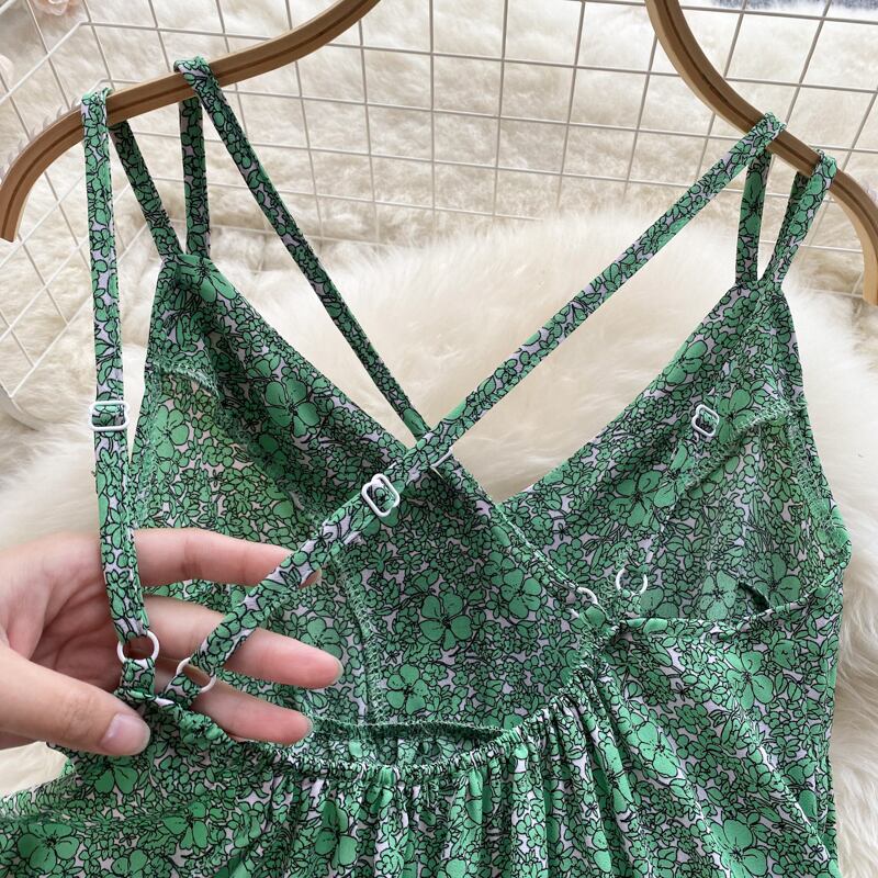 Small fresh green floral seaside holiday beach skirt sweet and spicy style loose and elegant temperament V-neck suspender dress 大人ガーリー スウィート キュート カジュアル エレガント ビーチ 花柄 スカート Vネック グリーン lyxaj57388568151