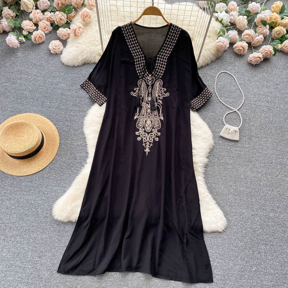 2022 summer dress new ethnic style embroidered cotton and linen retro loose and thin mid-length V-neck lace-up dress レッド コットン レトロ レース 刺繍 サマー 夏物 Vネック レースアップ lyxaj4488729688