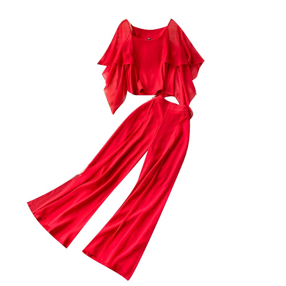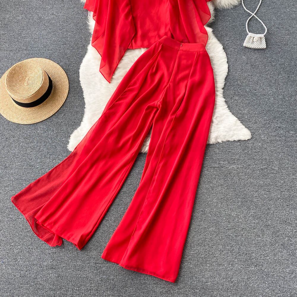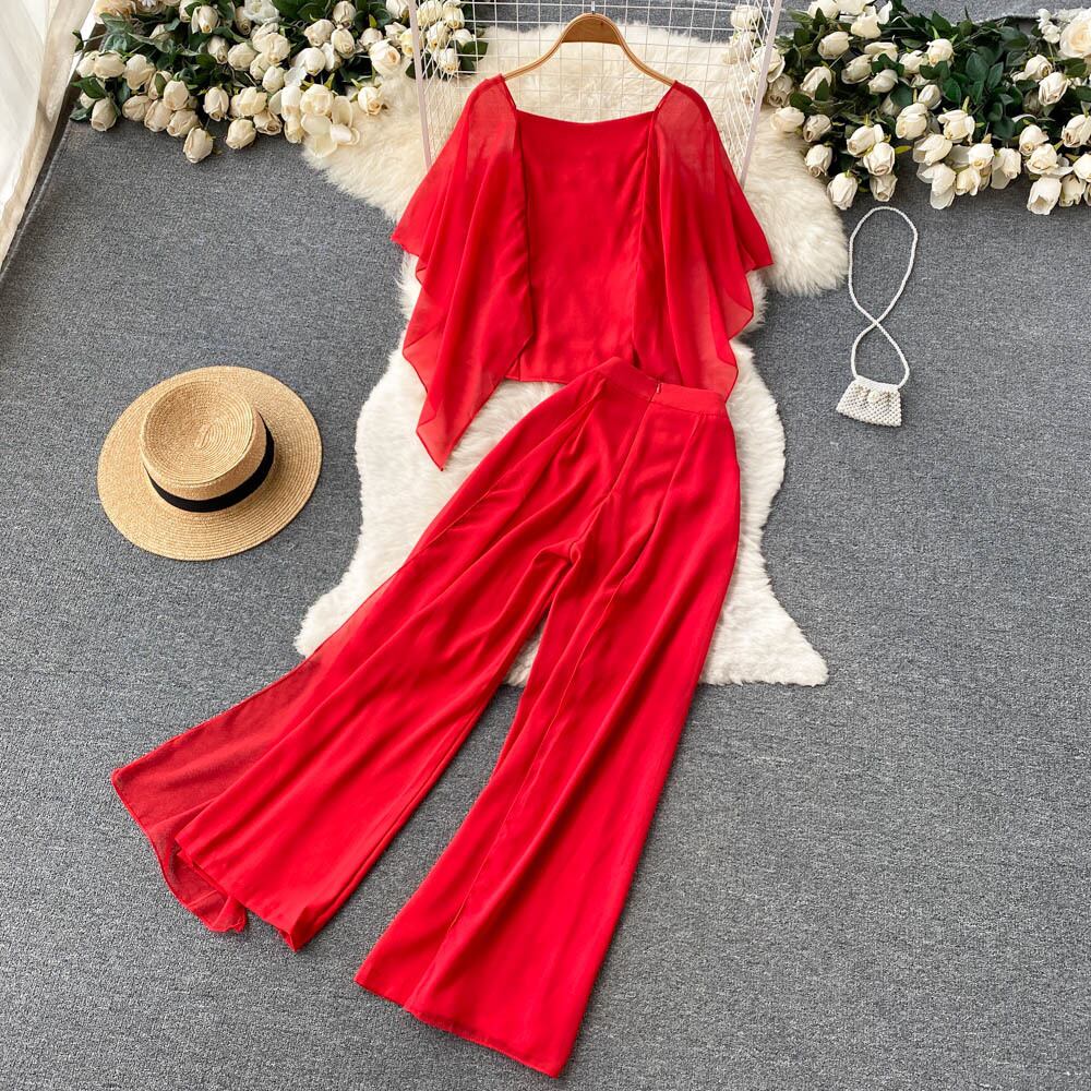 Hepburn style temperament square collar short chiffon top suit women's 2022 summer new high waist thin wide leg trousers ハイウェスト ショート シフォン サマー 夏物 ワイドレッグ ワイドパンツ スクウェア lyxaj10220283021