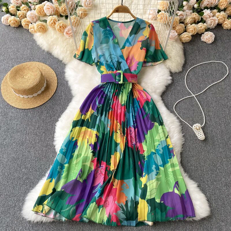Super fairy seaside vacation V-neck floral dress women's summer new lace-up waist pleated fairy skirt レース プリーツ サマー 夏物 花柄 スカート Vネック レースアップ lyxaj27856160902
