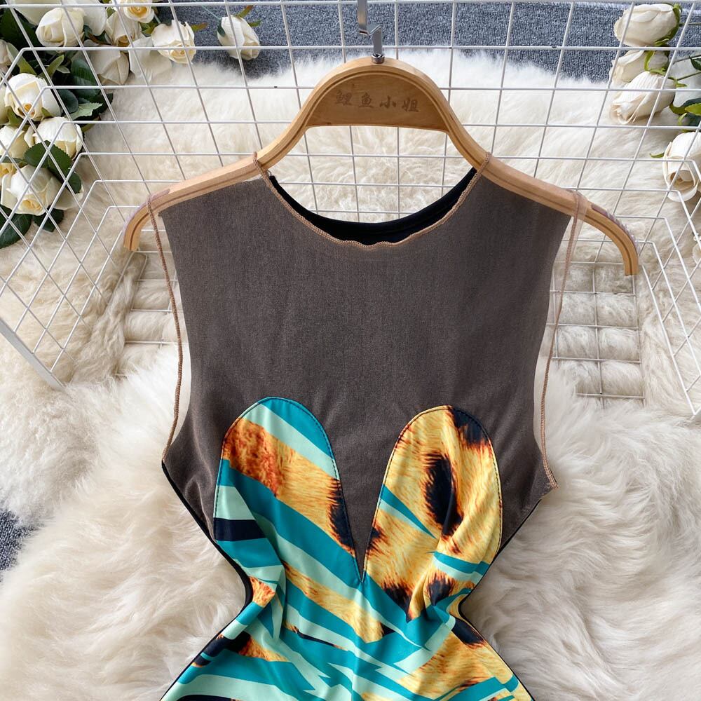 Printed stitching European and American style ins summer new sleeveless sexy color slim fit mid-length hip dress プリント サマー 夏物 ノースリーブ スリム ヨーロピアン ステッチ lyxaj35644078685