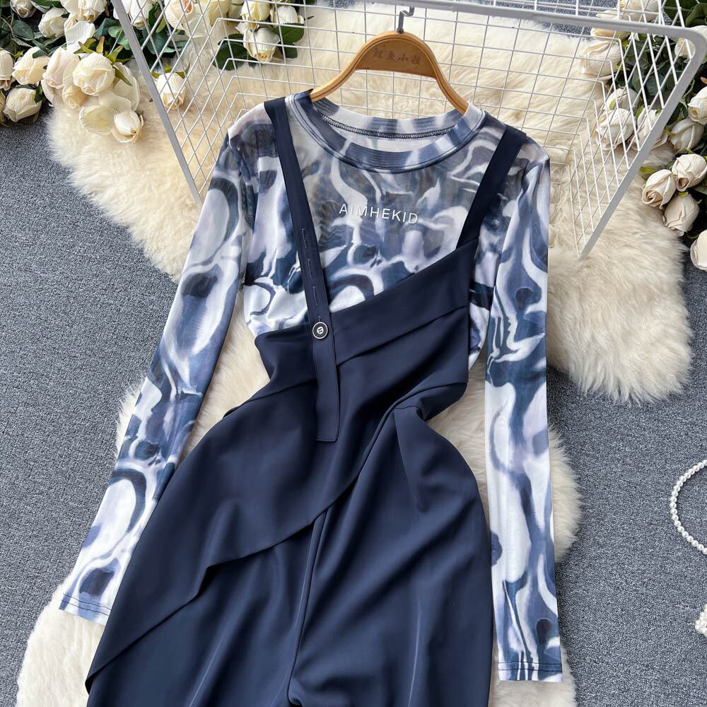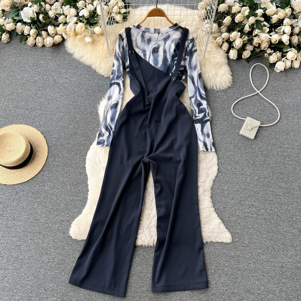 European and American ins print suits retro tie-dye thin tops women's high waist wide leg straps one-piece pants two-piece set ハイウェスト レトロ ワイドレッグ ワイドパンツ ヨーロピアン lyxaj28566720097