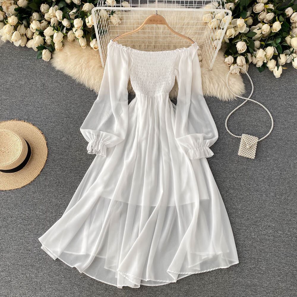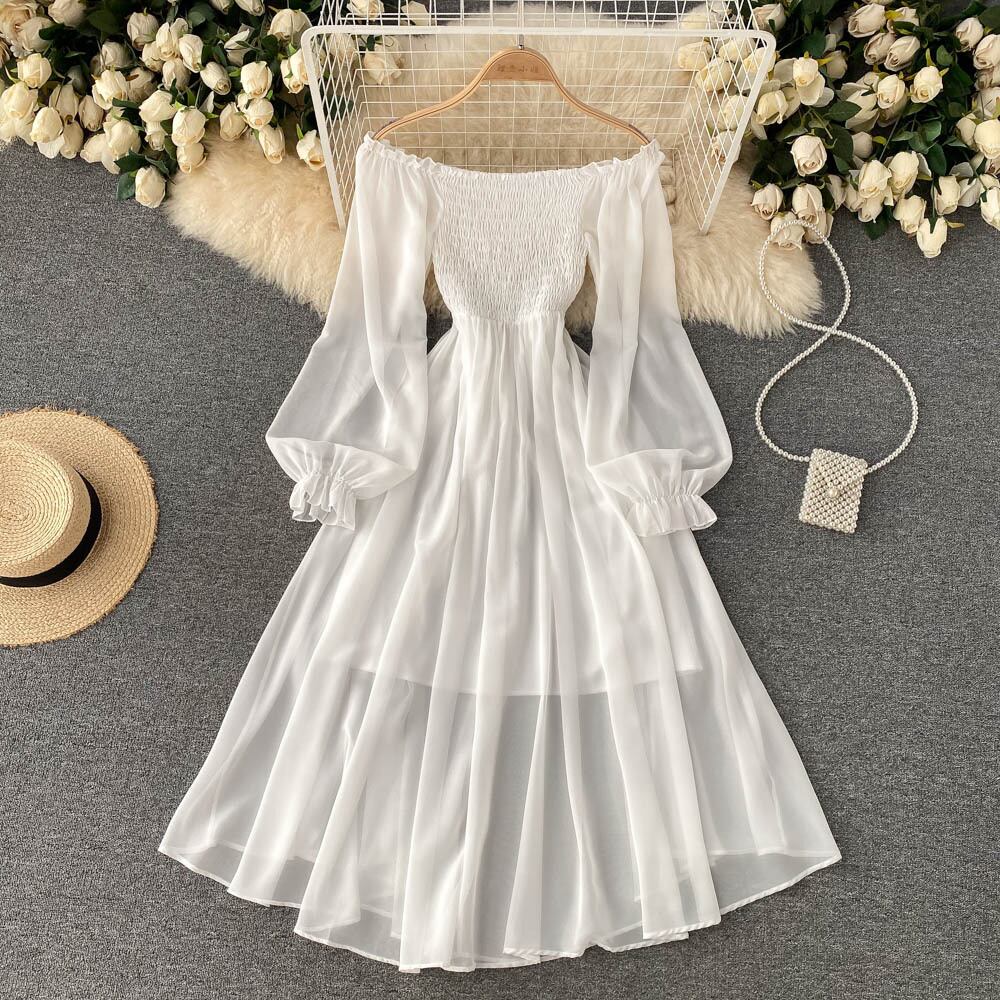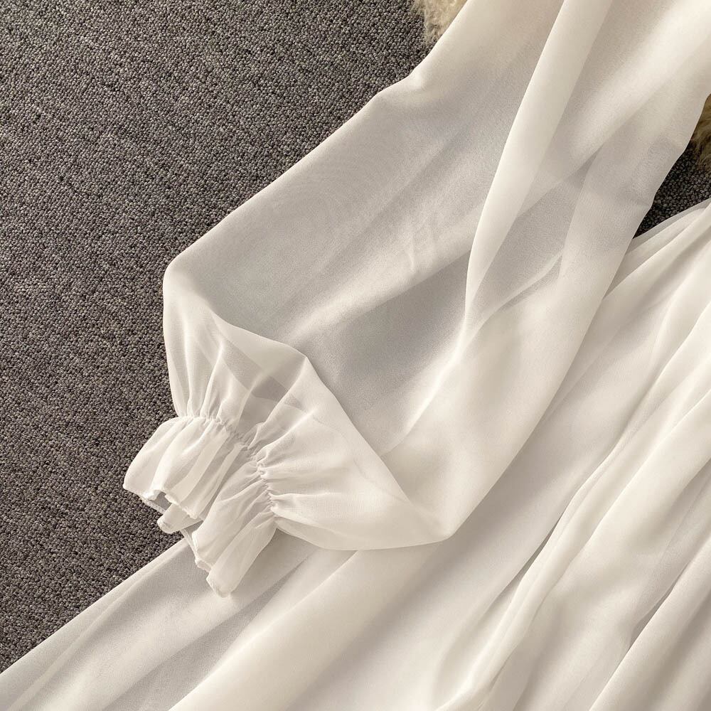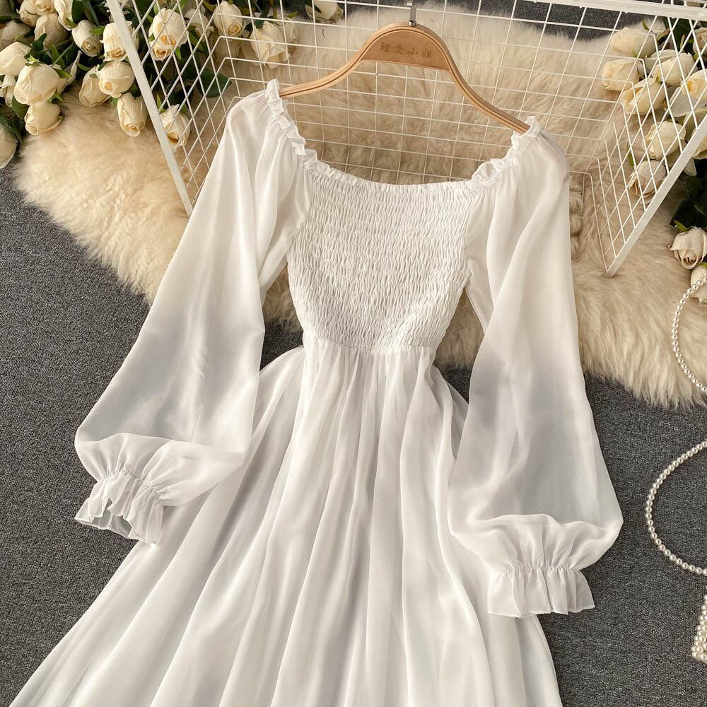 Travel pography vacation ins wind super fairy temperament dress female lantern sleeves square neck waist chiffon a-line skirt large swing long skirt ロング ランタンスリーブ シフォン スカート Aライン スクウェア lyxaj11516671751