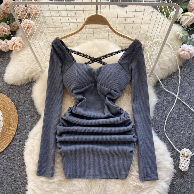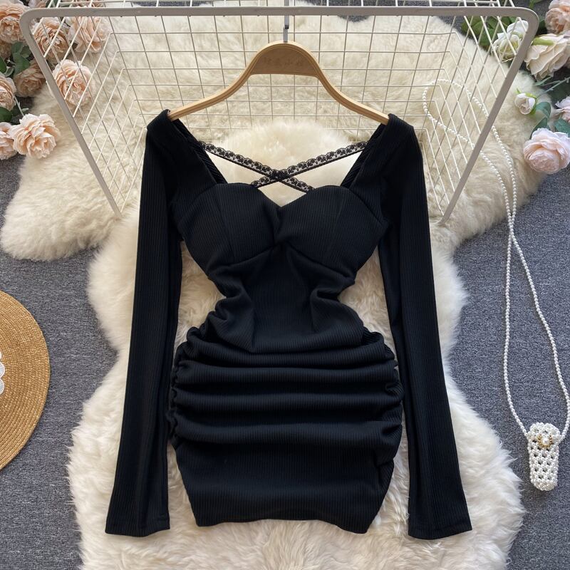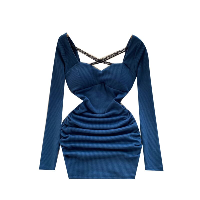 高品質の背中の開いた気質長袖ドレス秋の女性の純粋な欲望風ホットガールウエストプリーツバッグヒップスカート ロング オータム 秋物 ピュア lyxaj37879686206