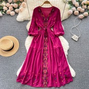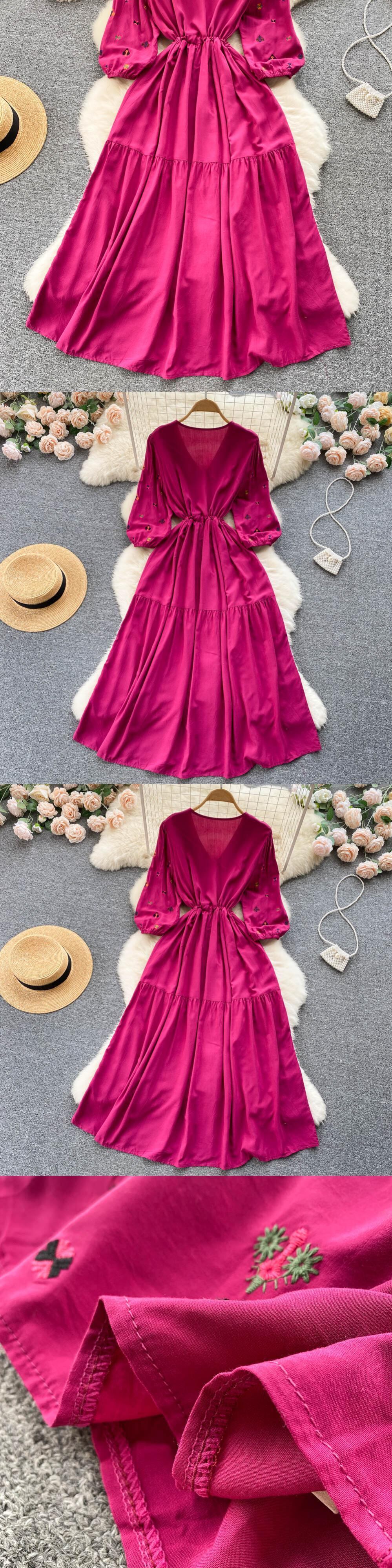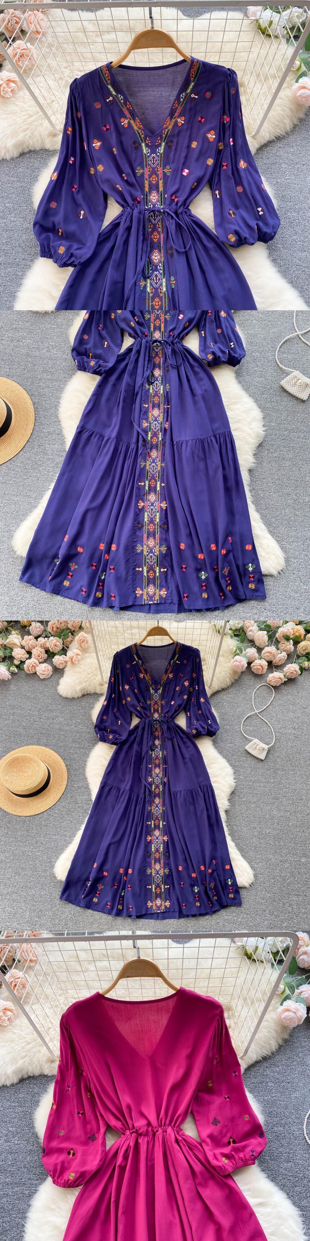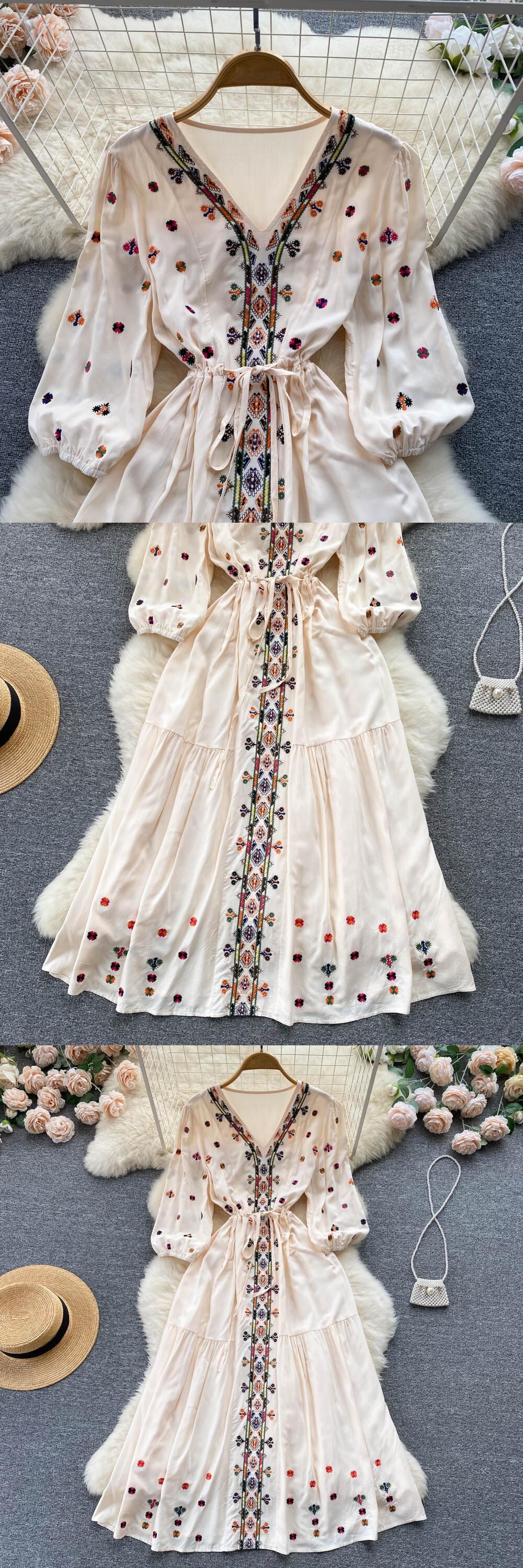 フランスのレトロなエスニック刺繍 V ネックのハイエンド ドレス女性の春と秋のドレス ウエスト痩身ロング スカート スプリング 春物 オータム 秋物 Vネック lyxaj88701761458