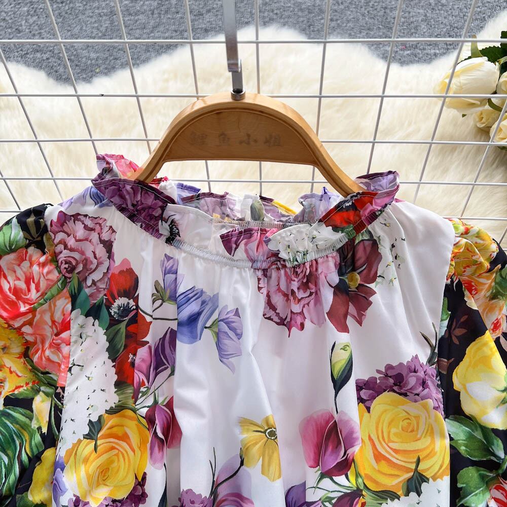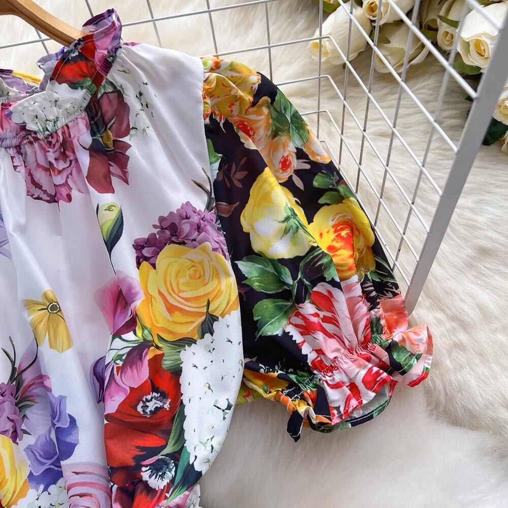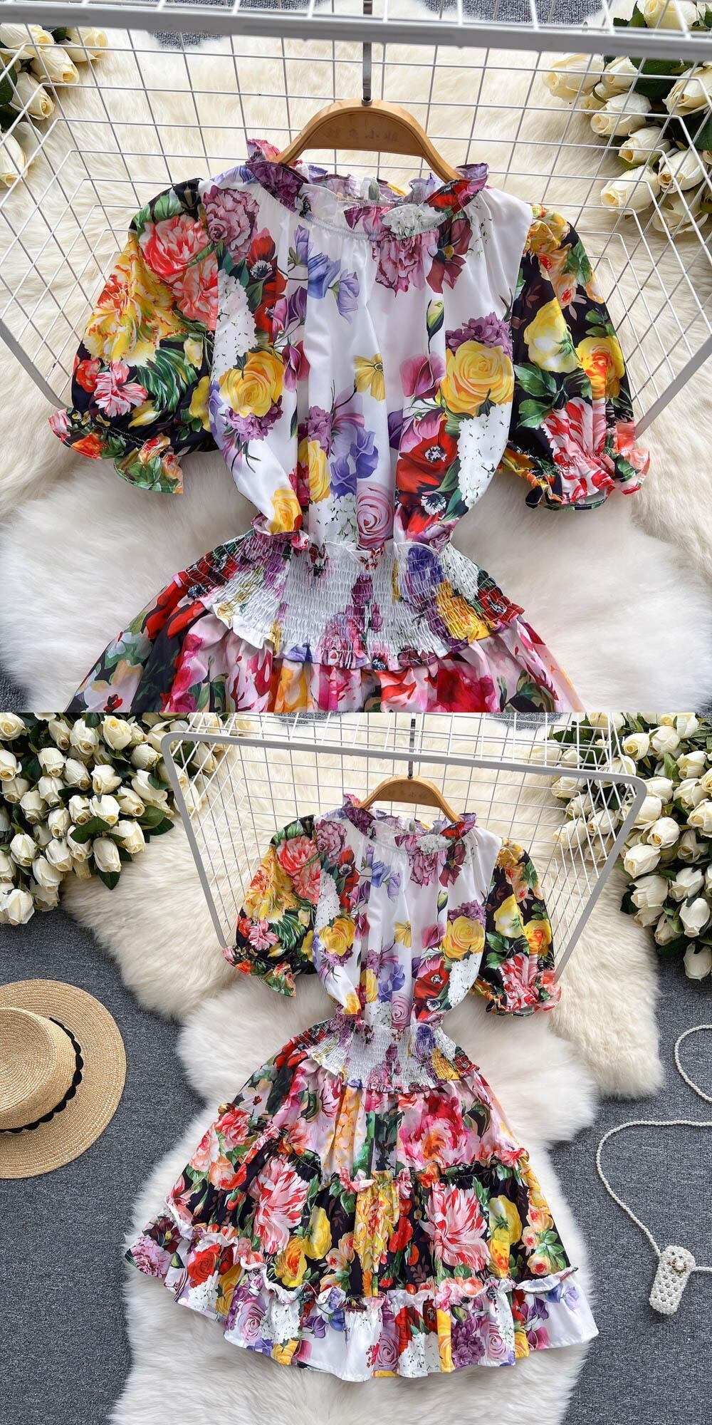 デザインセンス 宮殿風プリント コントラストカラー 蓮の葉衿 ハイウエストドレス レディース スリム スリム 半袖 ふっくらスカート ハイウェスト ショート レース ハーフスリーブ lyxaj34635970024