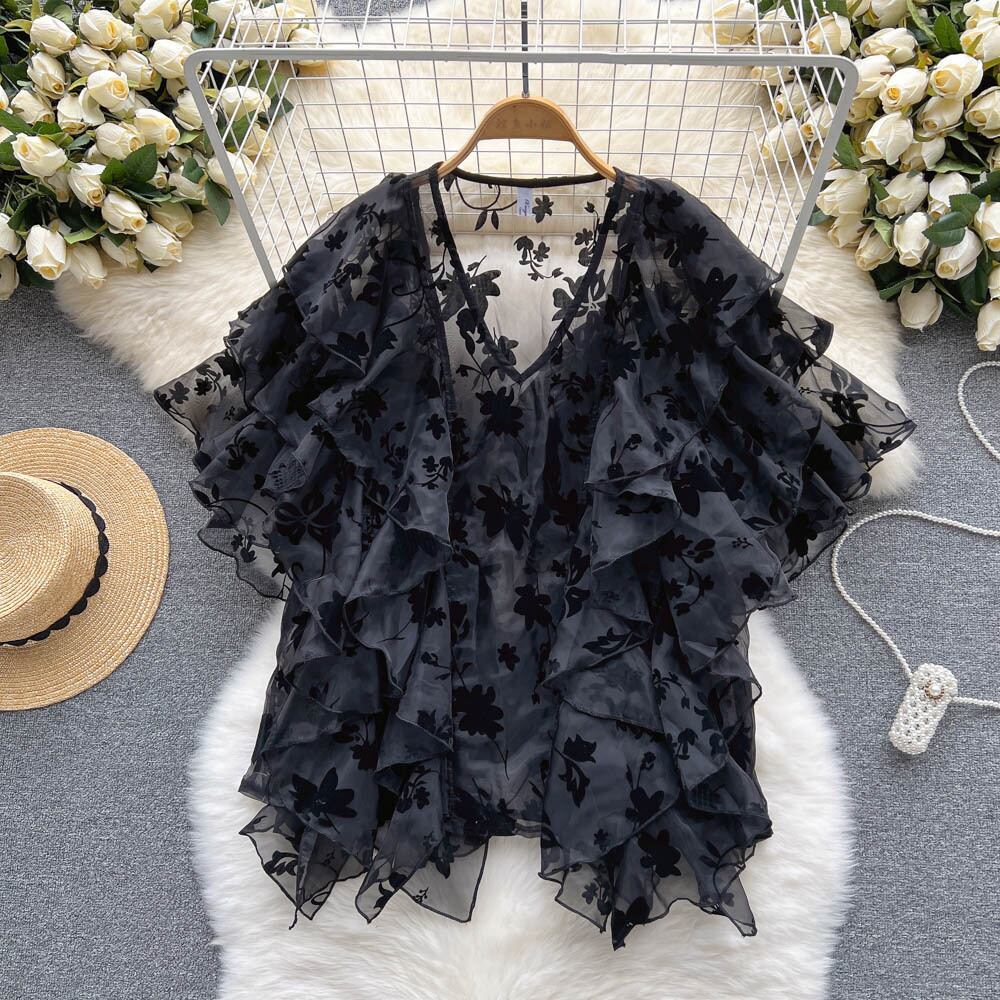 シックなデザインの薄いメッシュフロックフリルシャツ女性のニッチな外着超妖精の気質ルーズトップトレンディ lyxaj45524829567