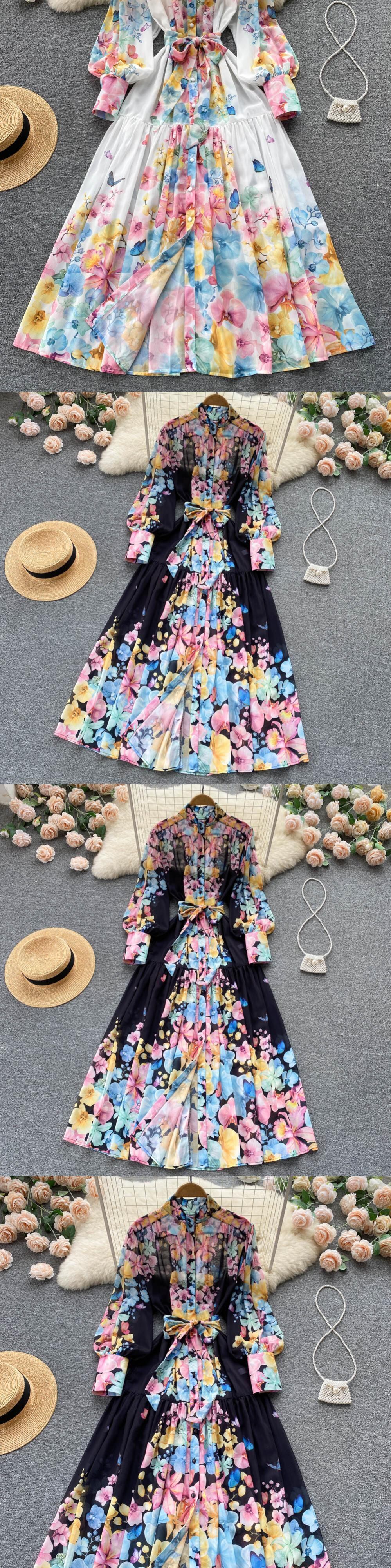 ティーブレイク フレンチ ハイエンド スタンドカラー 花柄ドレス レースウエスト 薄手 超妖精 ビッグスイング ロングスカート lyxaj98387631497