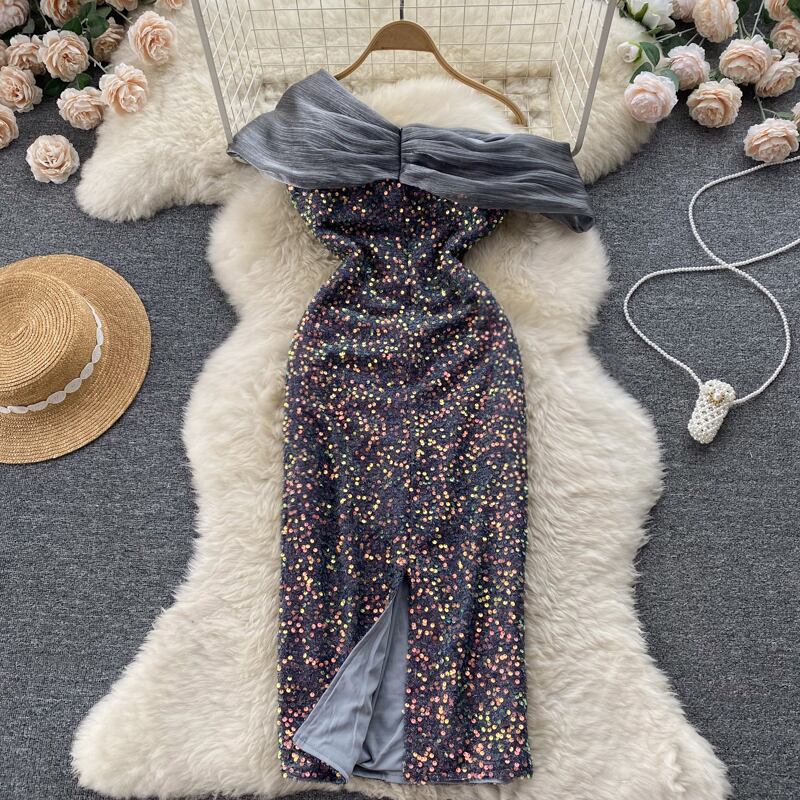 気質 セレブ デザイン センス 重工業 スパンコール ステッチ オーガンジー 斜め肩 ドレス ウエスト セクシー バッグ ヒップドレス トレンド lyxaj27958274000