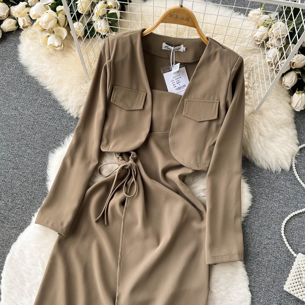 上質な長袖ショートスーツジャケットウエストスリットイレギュラースリングドレス秋レディースツーピース ロング オータム 秋物 lyxaj13098190796