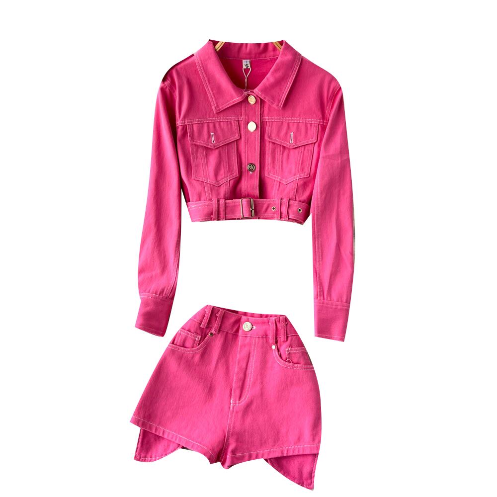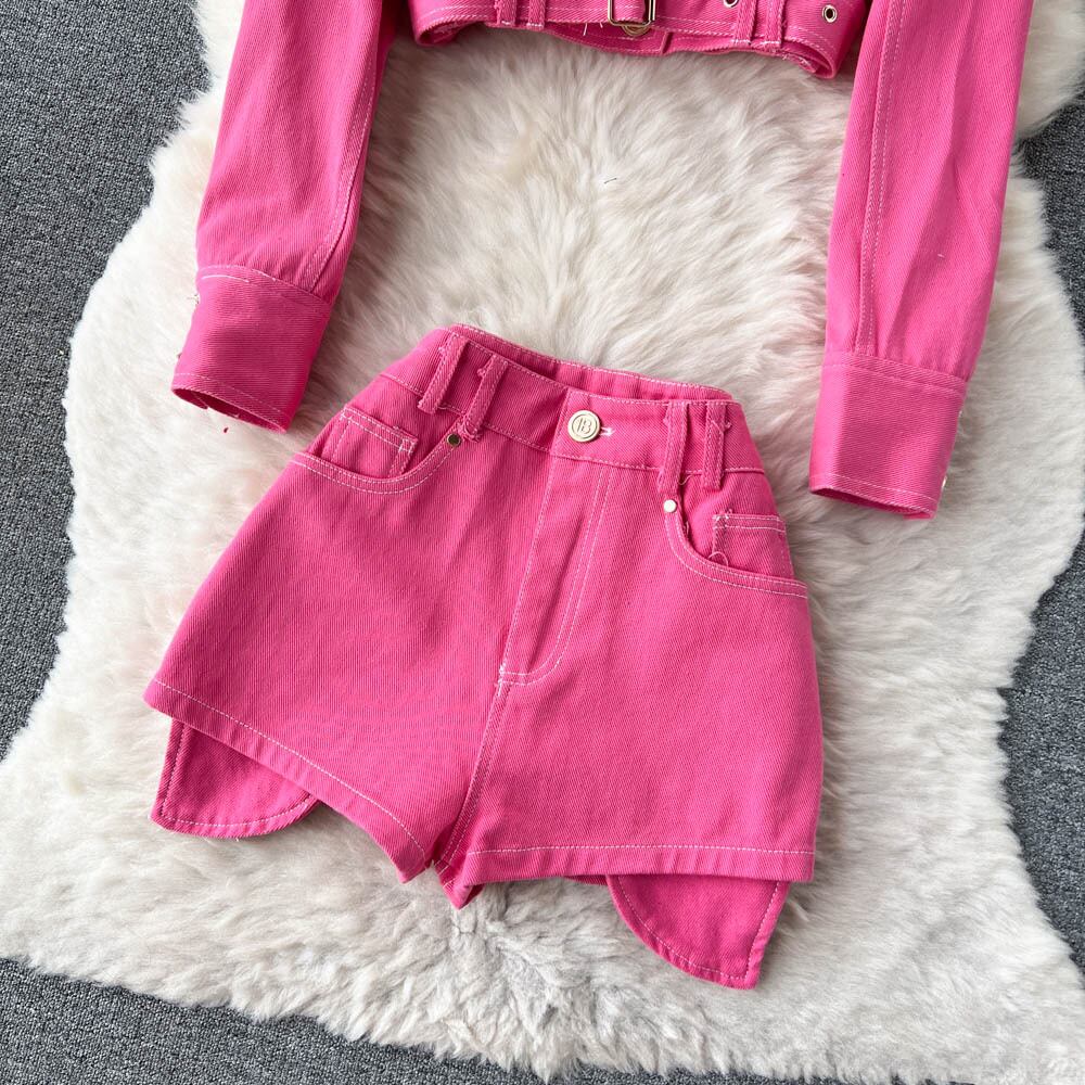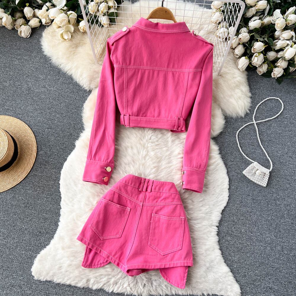 ホットな女の子はツーピースのスーツ、女性の秋のファッション、洋風、ファッショナブルなデニムのショート ジャケット、ハイ ウエストとワイド レッグのショート パンツを着ています。 ハイウェスト オータム 秋物 ショーツ ブルマー ワイドレッグ ワイドパンツ lyxaj75659569142