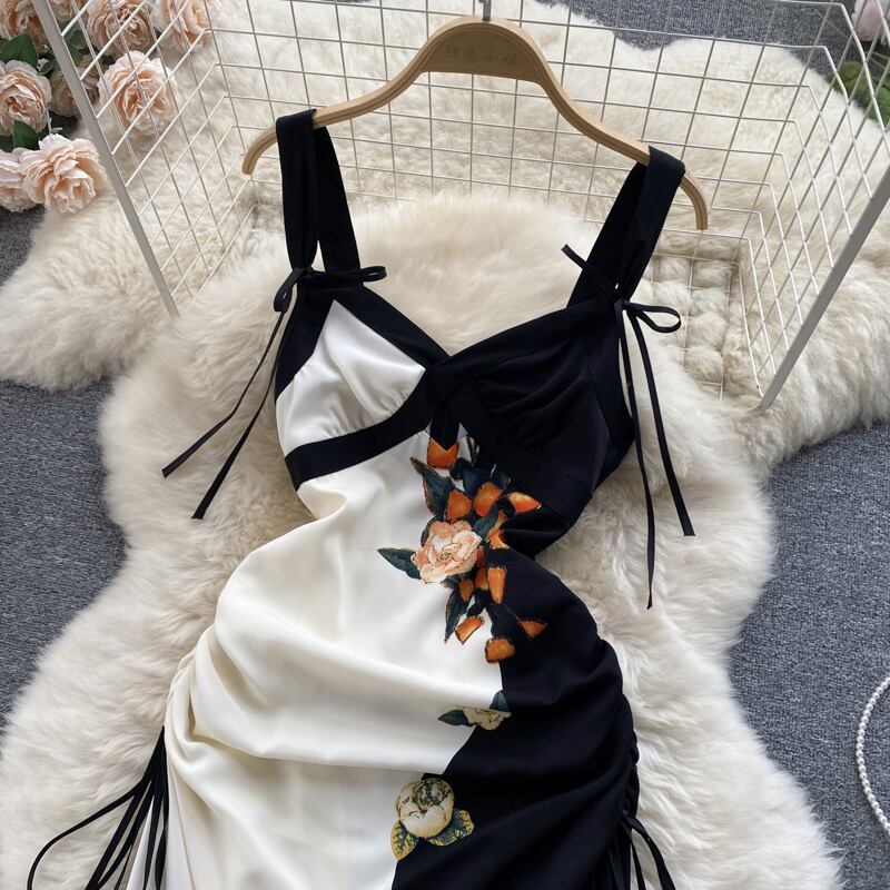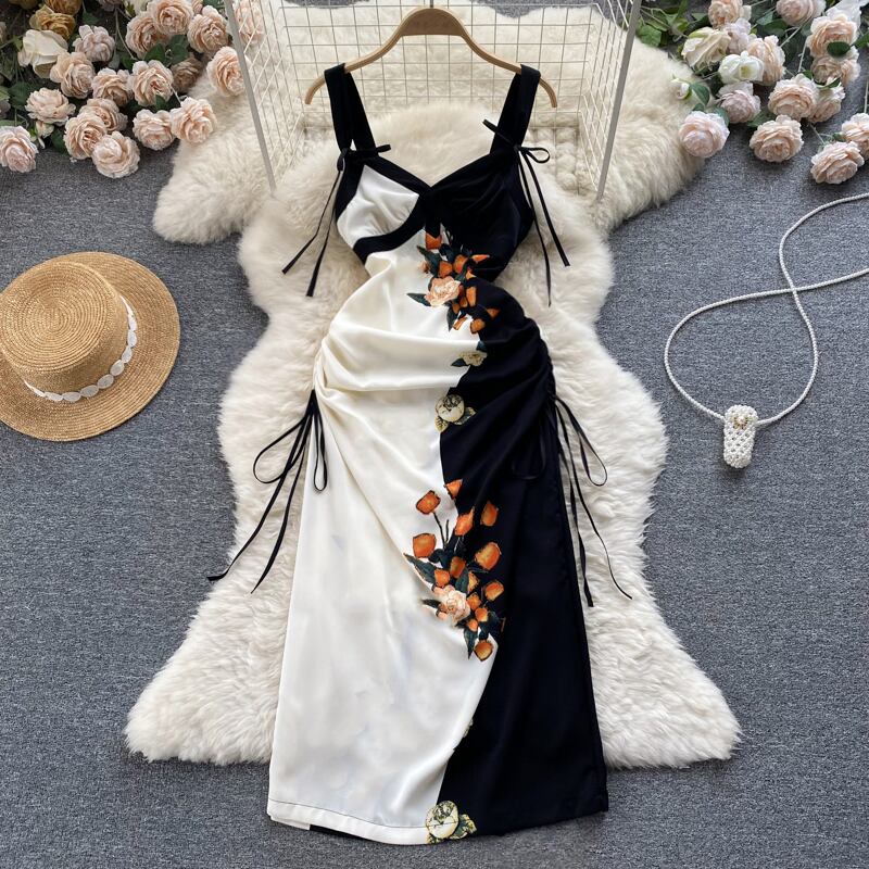 高品質のニッチなデザインの印刷の対照的な色の気質サスペンダー ドレス夏の女性のレースのウエスト A ライン ロング スカート サマー 夏物 Aライン lyxaj64075369303