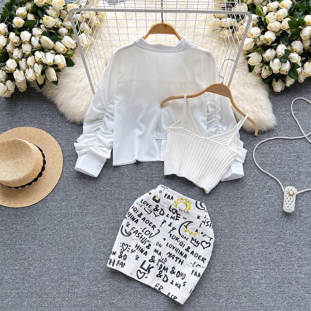 有名人の気質スリーピース スーツ 2022 夏薄い女性の日焼け止めシャツ ニット小さなサスペンダー プリント スカート サマー 夏物 lyxaj73943665809