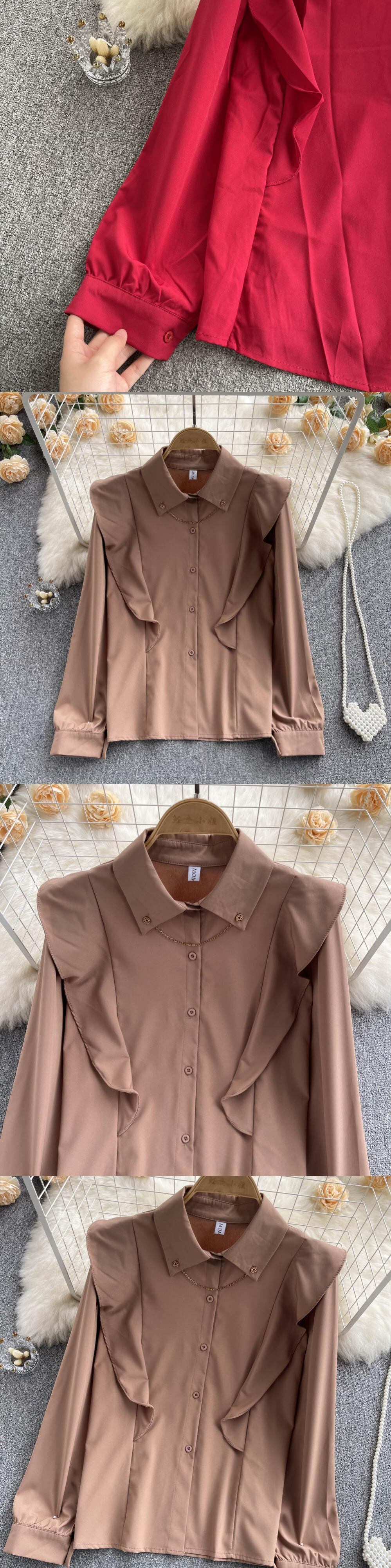 フレンチ気質ポロ襟シングルブレストステッチフリル韓国語バージョン新鮮なシャツ女性のゆったりとしたオールマッチ長袖トップ ロング lyxaj73238210798