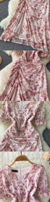 セレブライトおなじみのハイエンドスパンコールプリントドレスプリーツレースイレギュラースリット半袖Vネックミディスカート lyxaj94439416765