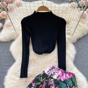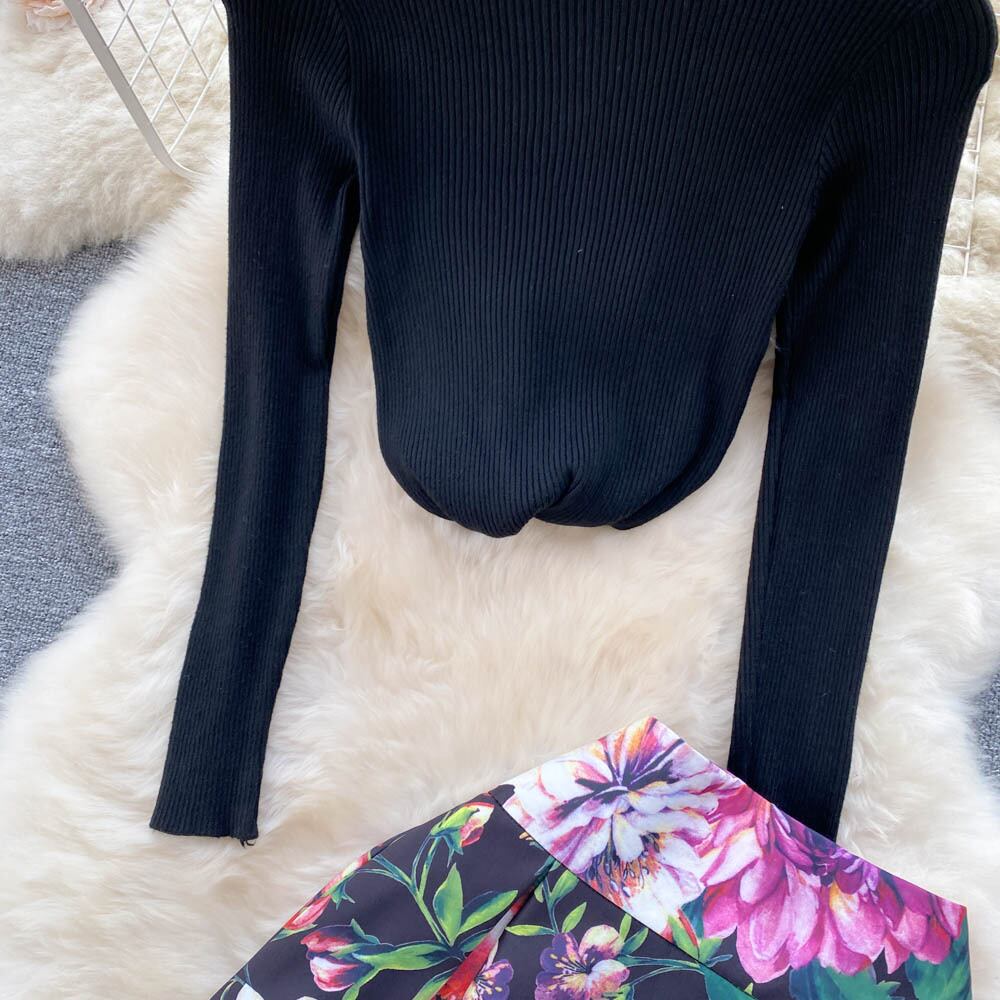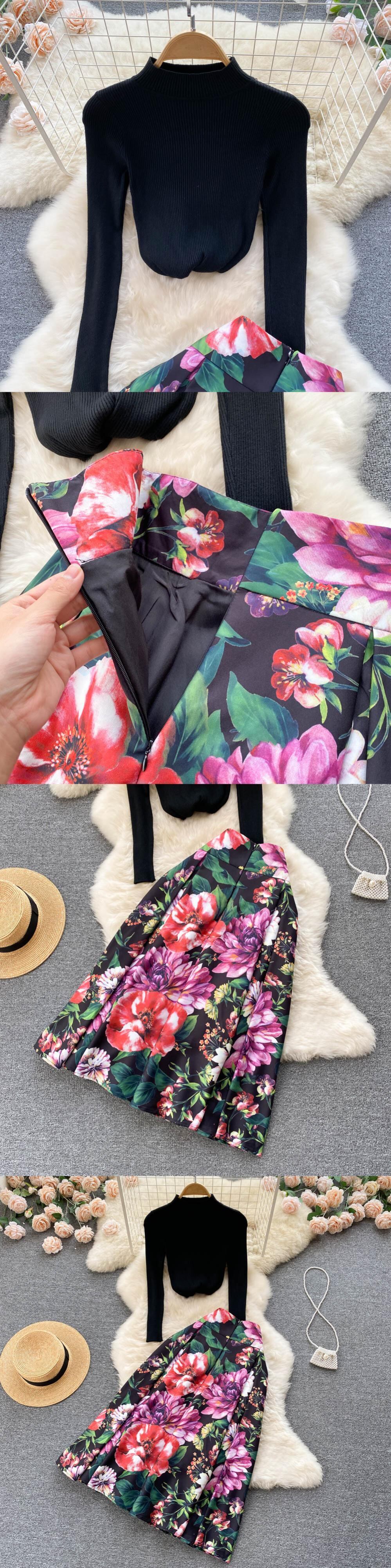 Hong Kong style suit black sweater knitted sweater fashion mid-length print pocket large swing skirt two-piece suit ブラック スカート lyxaj99739446397