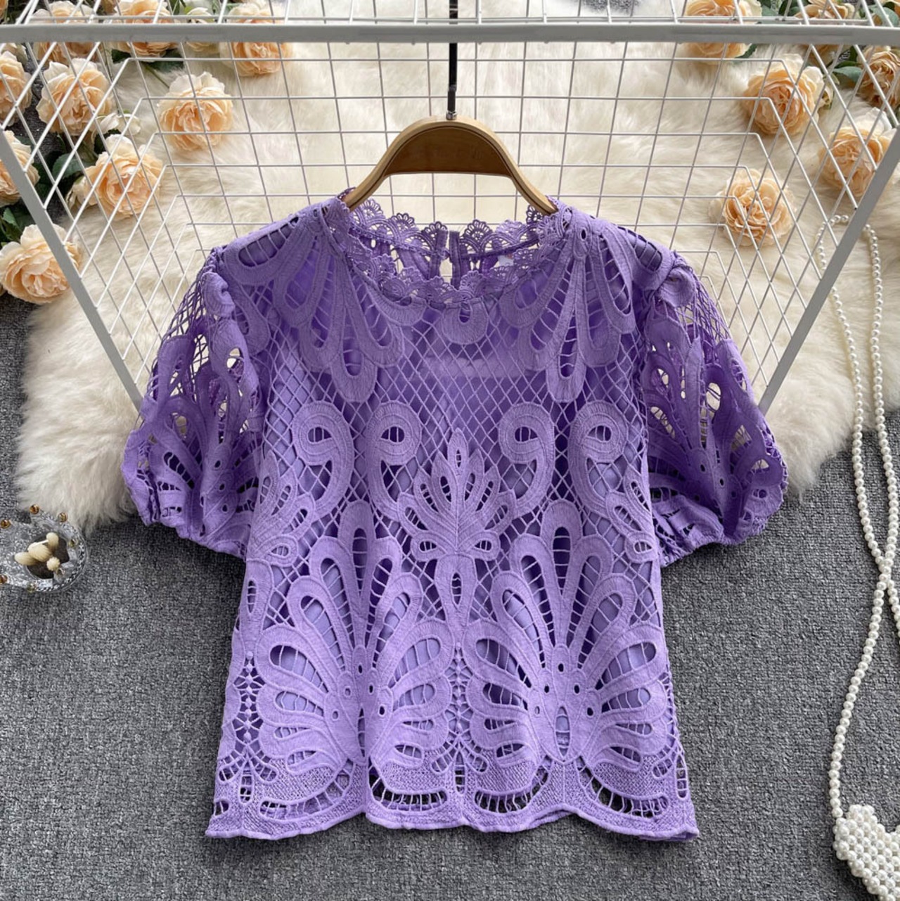レーストップ女性のデザインセンスニッチ中空波状エッジショート気質パフスリーブルーズオールマッチ妖精シャツ lyxaj16200360933