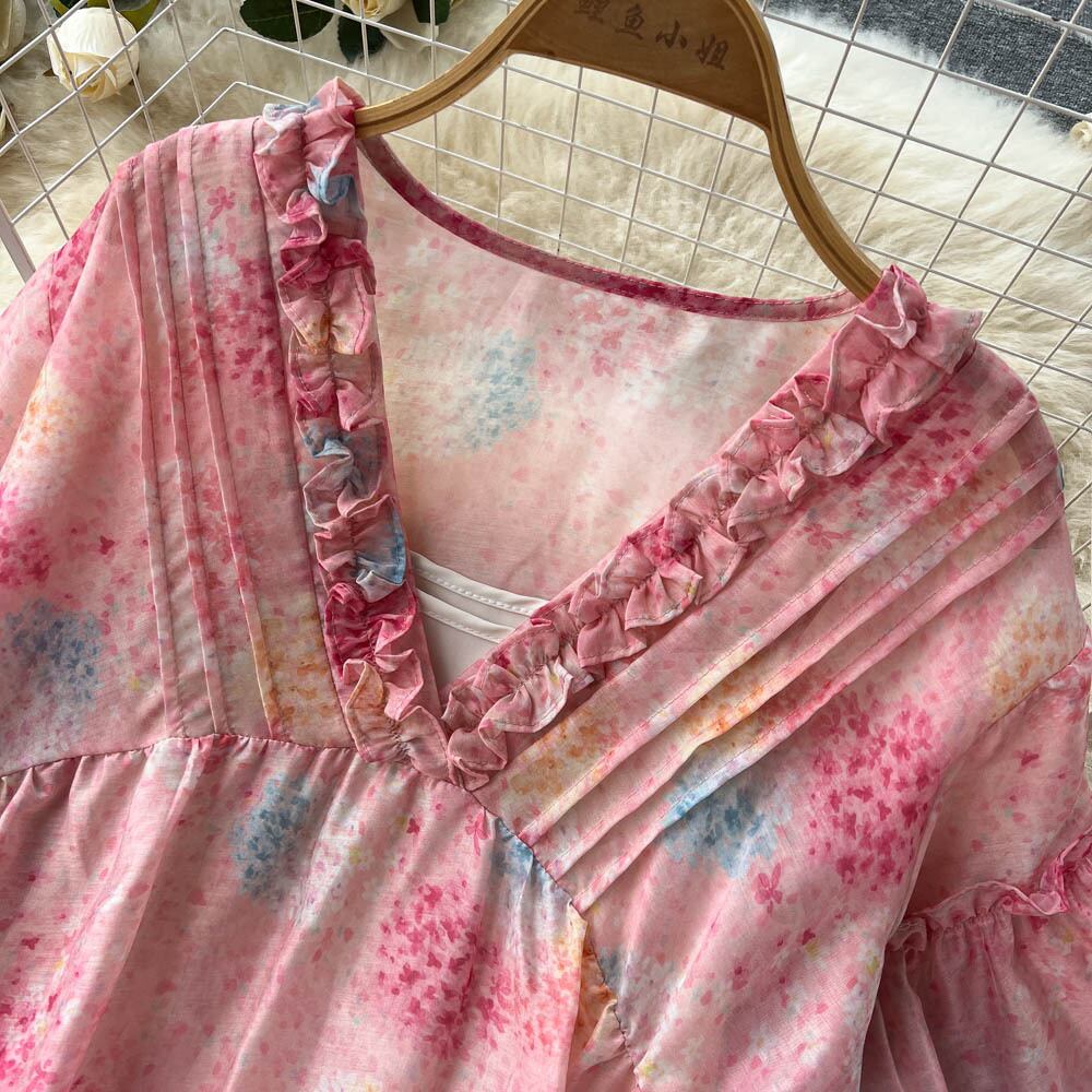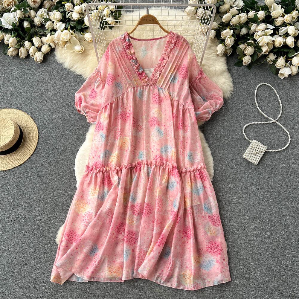 フランスの年齢を減らすVネックプリントパフスリーブドレス2022年夏の新しいルーズサスペンダースカートと2点セット サマー 夏物 lyxaj22411217590