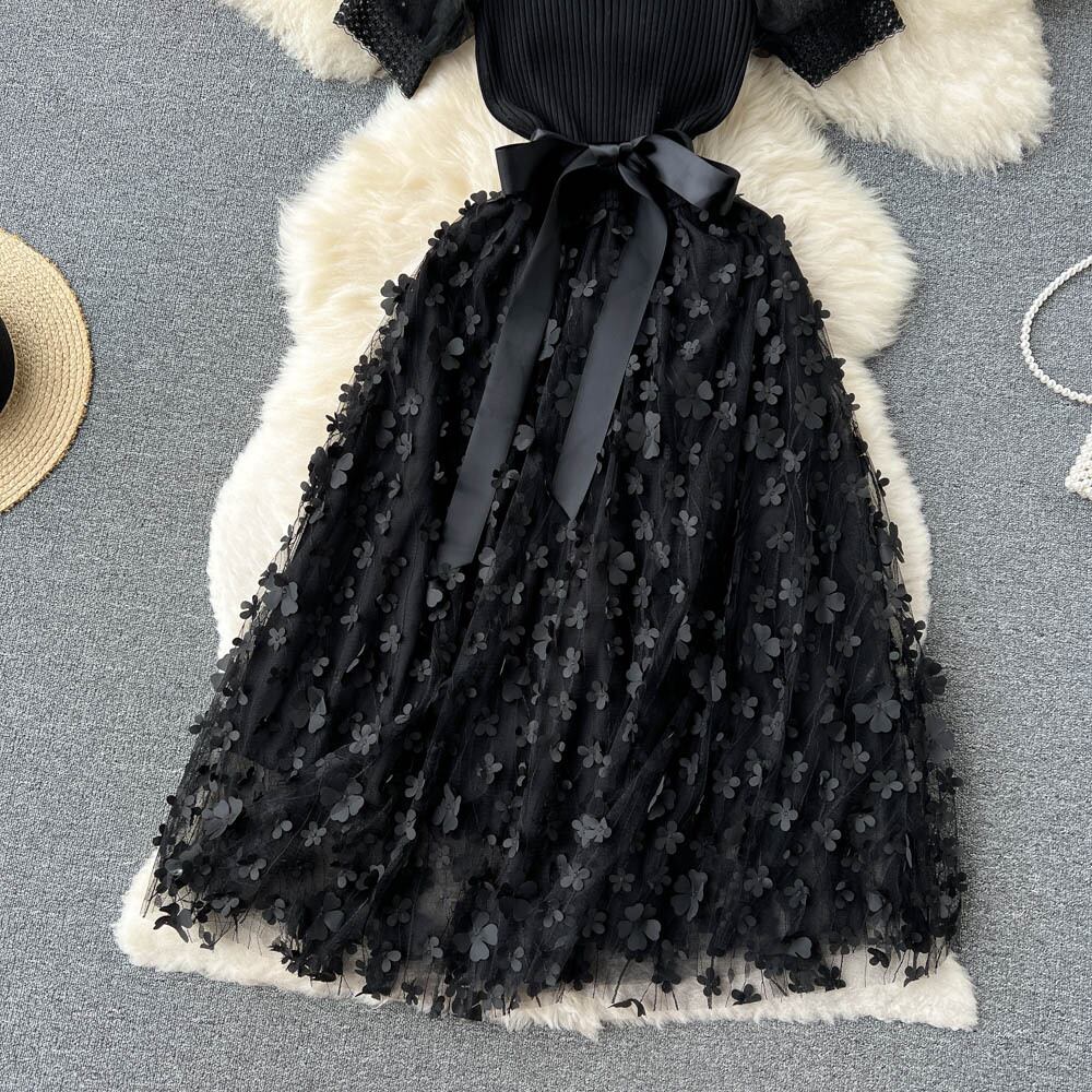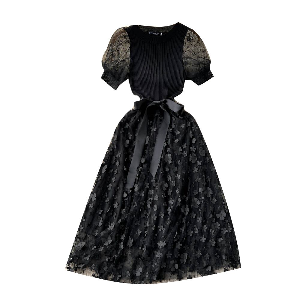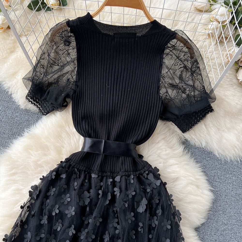 ヘップバーンスタイルティーブレイクフレンチハイエンドセンスメッシュパフスリーブドレスレディースサマーウエスト気質ふわふわAラインスカート 夏物 lyxaj57308315762