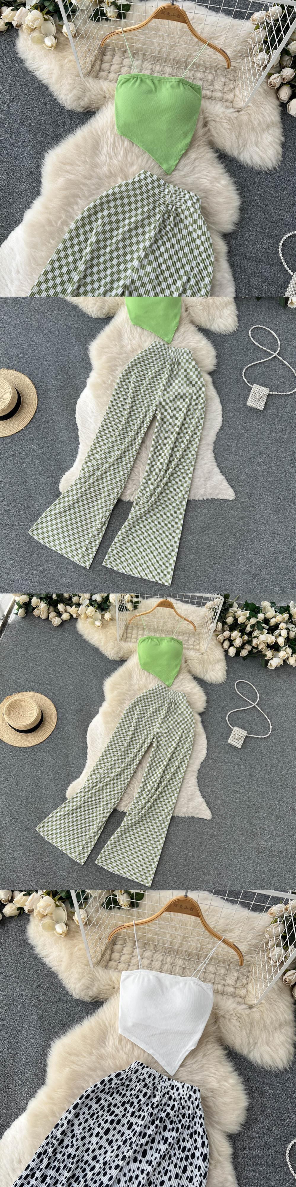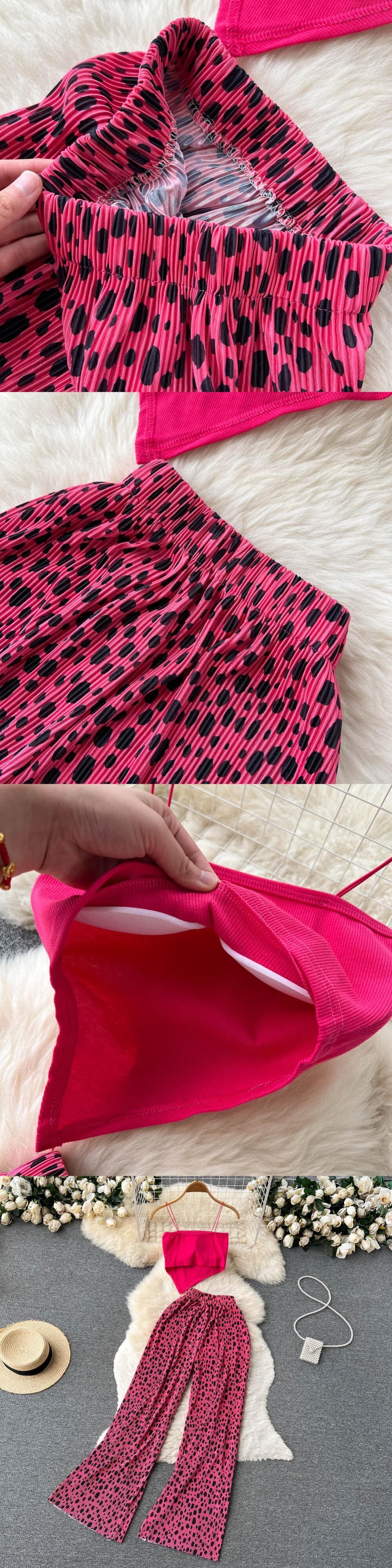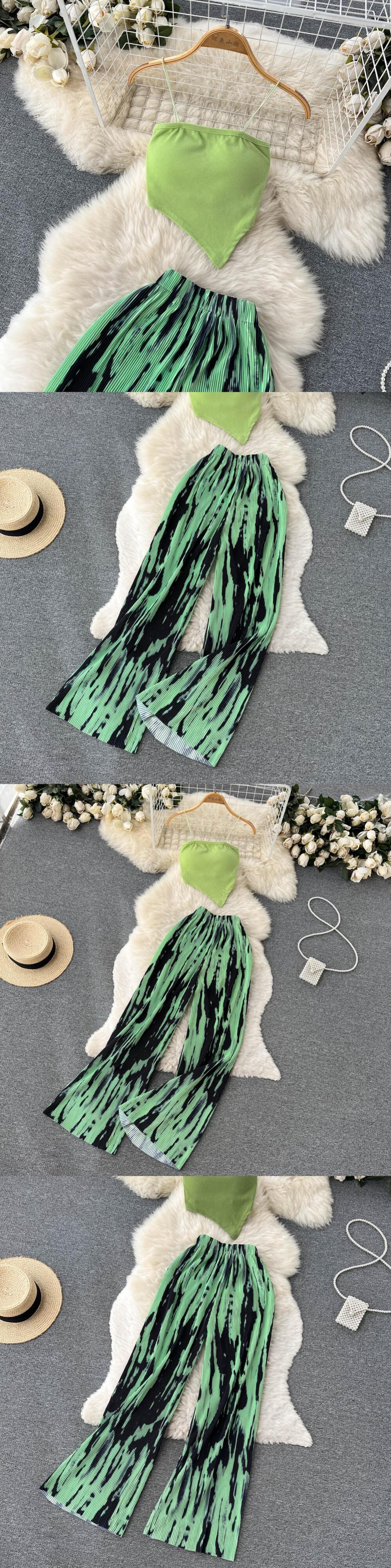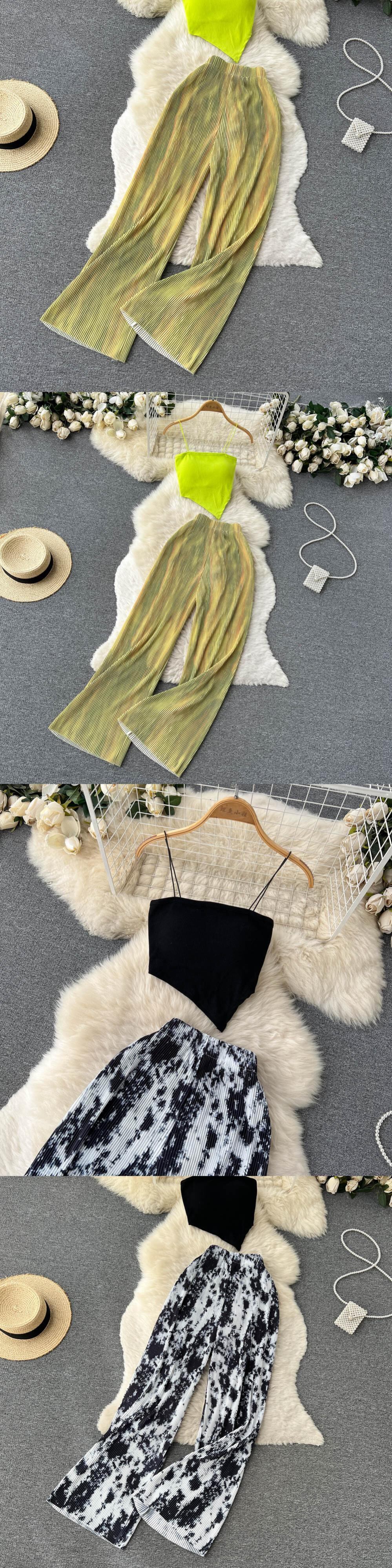 ホットガールスーツ女性気質チューブトップサスペンダーショートニットトップ洋風プリントハイウエストワイドレッグパンツ 2 点セット ハイウェスト ワイドパンツ lyxaj4027730055