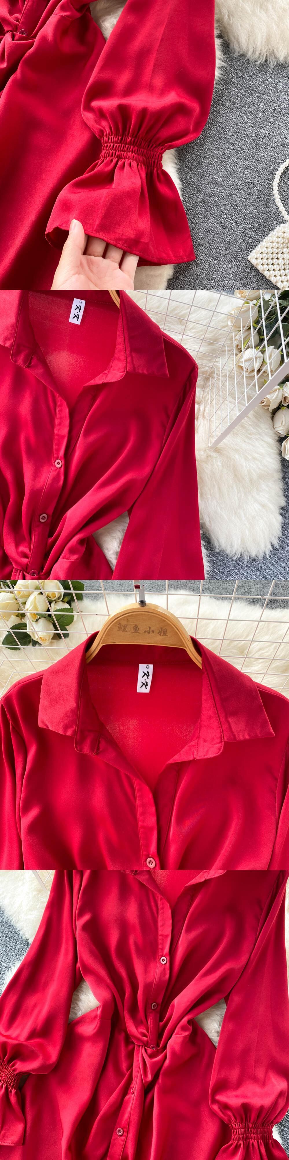 Yujieの軽くて親しみやすいスタイルはシックで見事な赤いベルスリーブのドレスの夏の女性のフランスの気質のシャツのスカートです レッド サマー 夏物 lyxaj17411859326