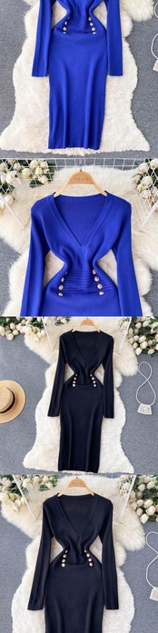 軽快な大人スタイルのセクシーなVネックニットワンピース 秋の女性の洋ナシ型ウエストニット長袖ヒップスカート ロング オータム 秋物 lyxaj76636064681