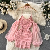 甘くてセクシーな純粋な欲望の女の子のドレス女性ウエスト プリーツ オフショルダー デザイン感覚ホルター ネック スリング ホット ガール ショート スカート 大人ガーリー スウィート キュート カジュアル ピュア lyxaj7445821519
