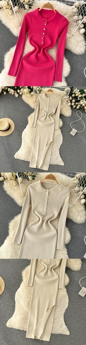上質なポロ衿ワンピ 秋 レディース ヘップバーン風 キレイめウエスト スリット 長袖 ニット ヒップスカート ロング オータム 秋物 lyxaj40649466988