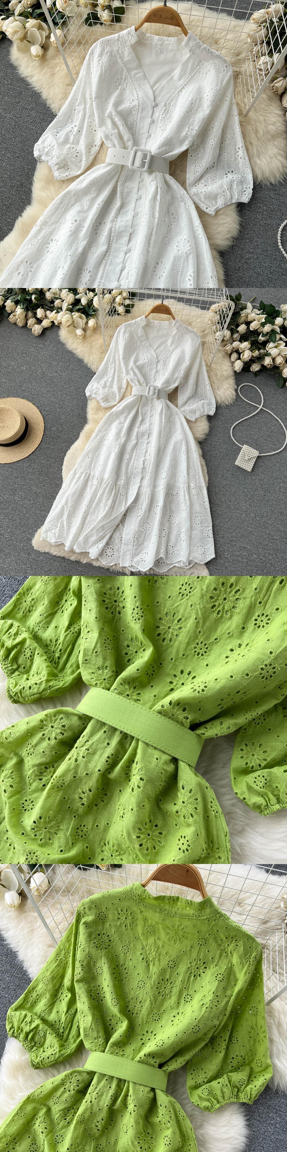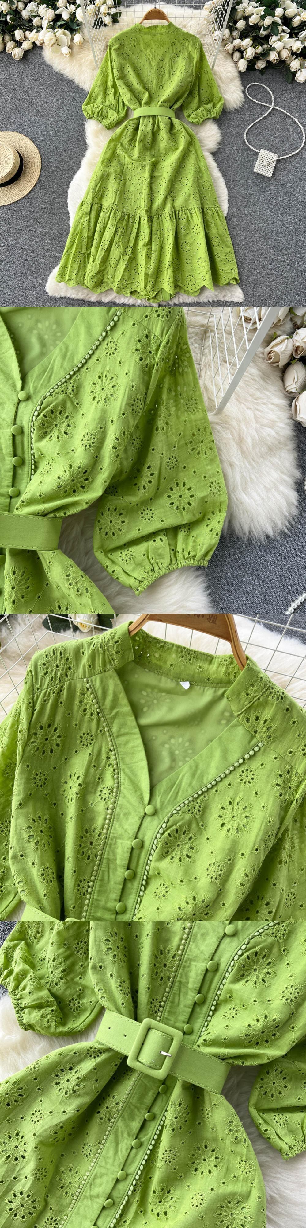 Vネック中空ワンピ レディース パフスリーブ 新作 ゆったり 刺繍 軽く馴染む スタイル ウエスト ウエスト スリム フリル ロングスカート lyxaj14509169337