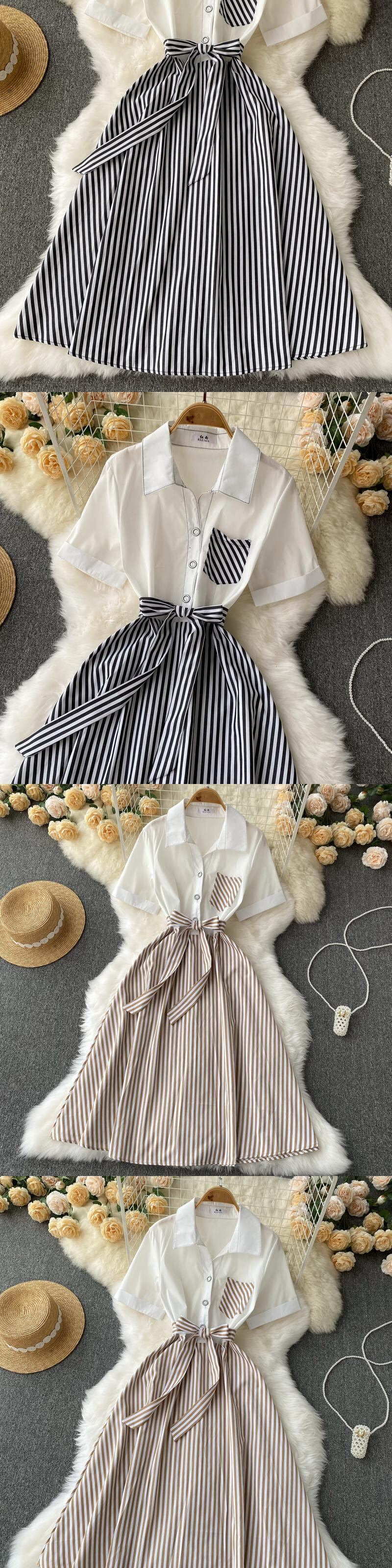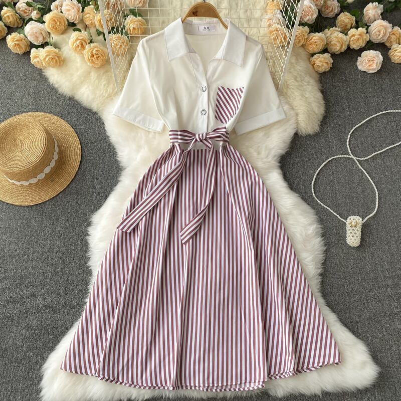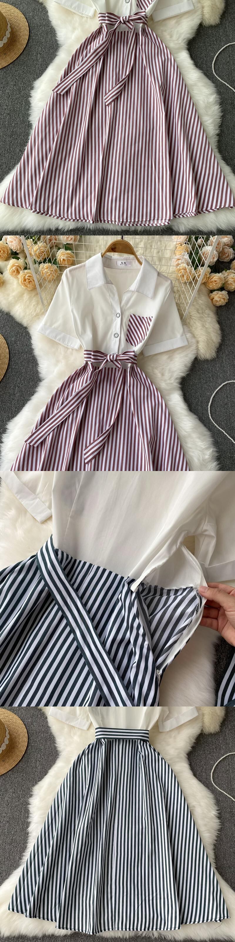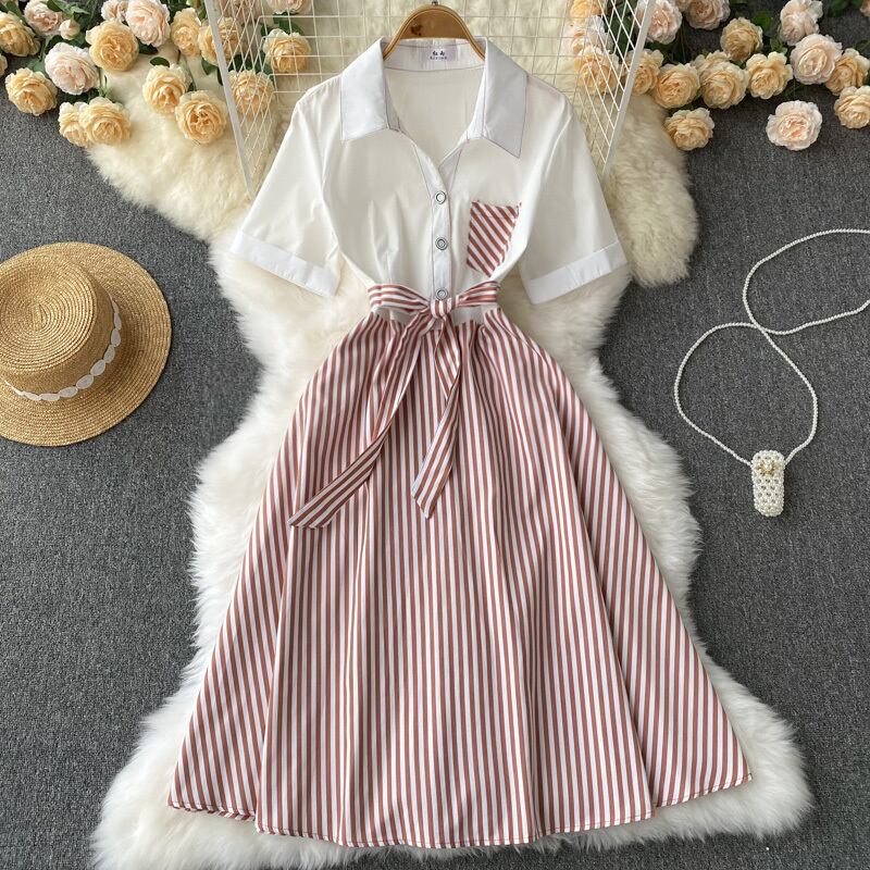 半袖シャツ レディース デザインセンス ニッチ コントラストカラー ステッチ レトロ ストライプ Aライン 大きく揺れる ミドル丈 ワンピース レディース 夏 サマー 夏物 lyxaj7191851383