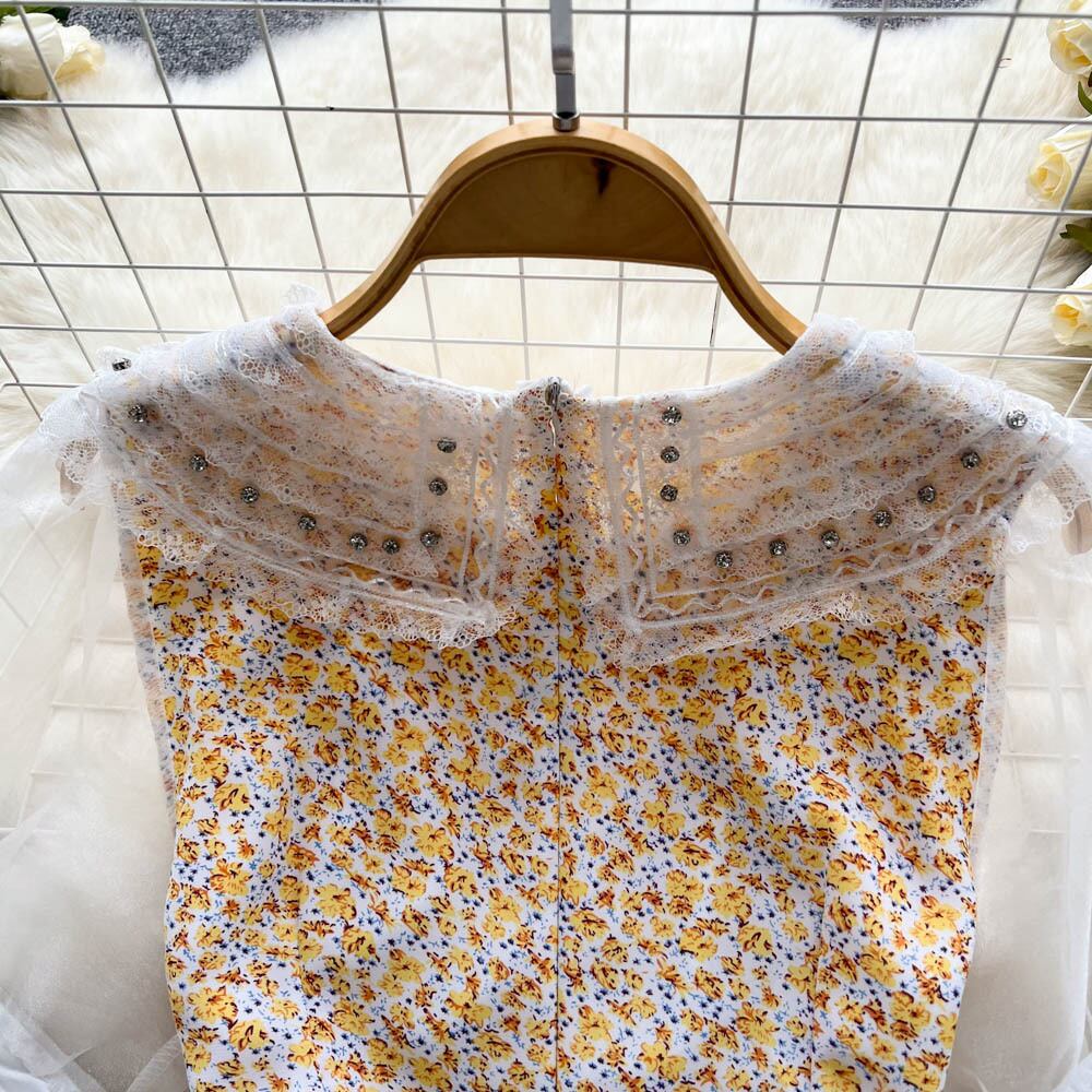 夏の新しい甘い花の人形の襟フランスの優しい初恋スカート スリムな気質メッシュ パフ スリーブ A ライン スカート 大人ガーリー スウィート キュート カジュアル サマー 夏物 花柄 Aライン lyxaj9028663662