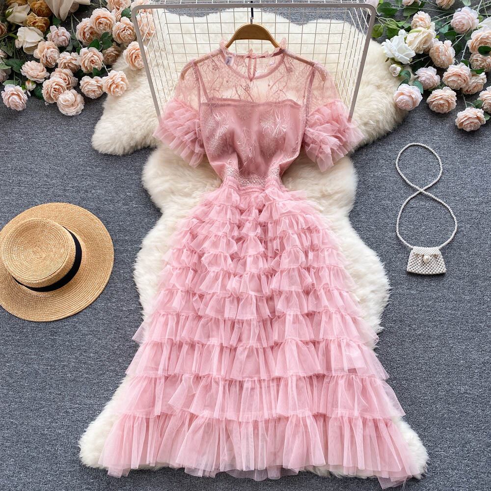 フランスの甘いニッチなデザインのセンス レース中空半袖ドレス夏の女性のウエスト スリム ケーキ スカート 大人ガーリー スウィート キュート カジュアル サマー 夏物 lyxaj61151706166