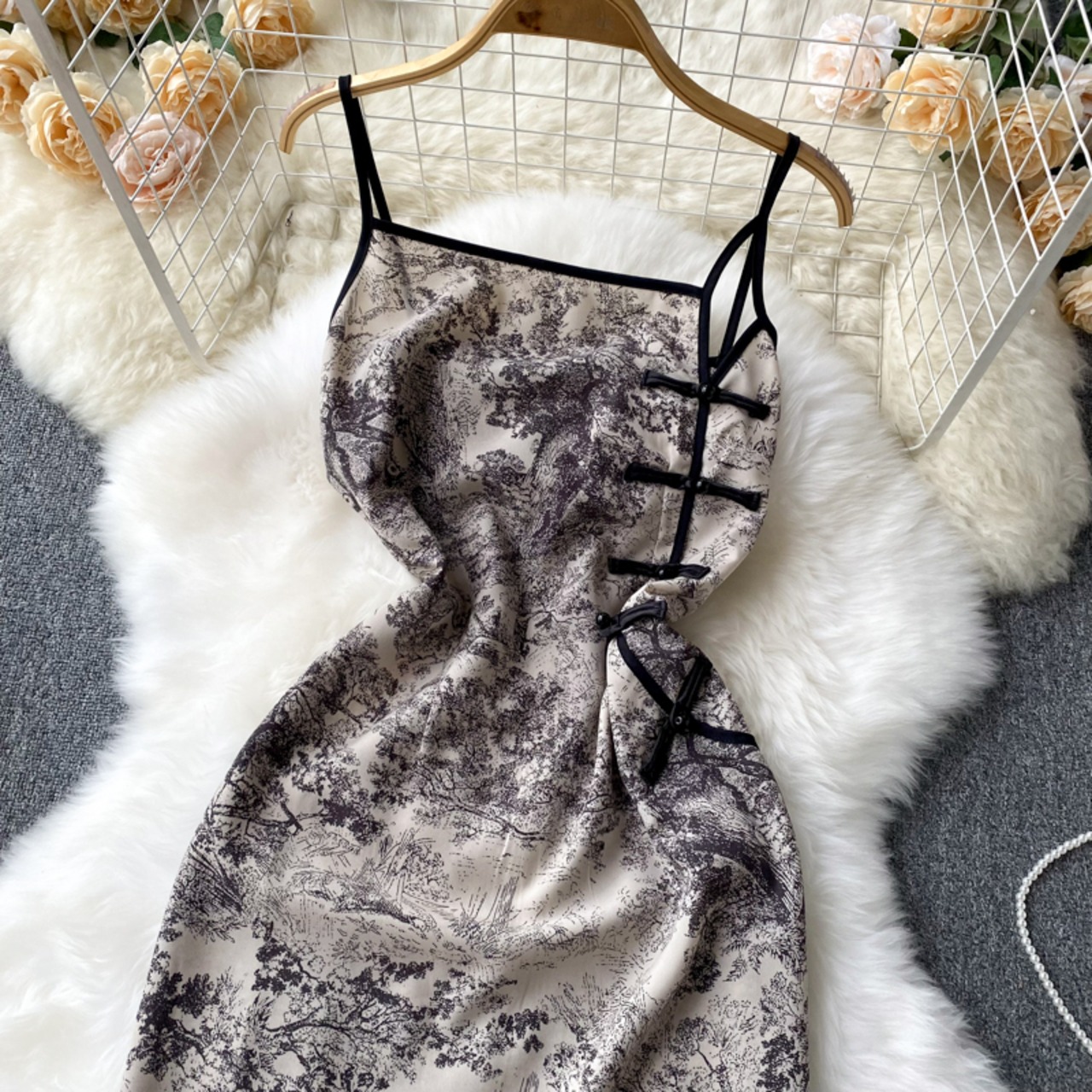 改良されたチャイナ ドレス若いレトロなバックル デザイン スリング ドレス高品質スリム フィット プリント ヒップ A ライン スカート Aライン lyxaj54114878816