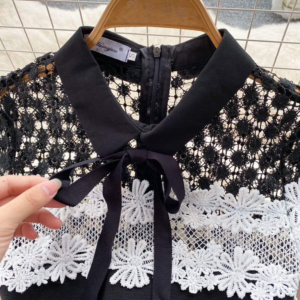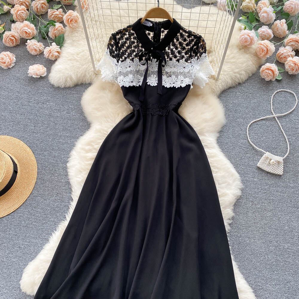 レトロヘップバーンスタイルリトルブラックドレス 2022 新気質スリムミッドレングスステッチ中空レースドレス女性の夏 サマー 夏物 lyxaj63181115351