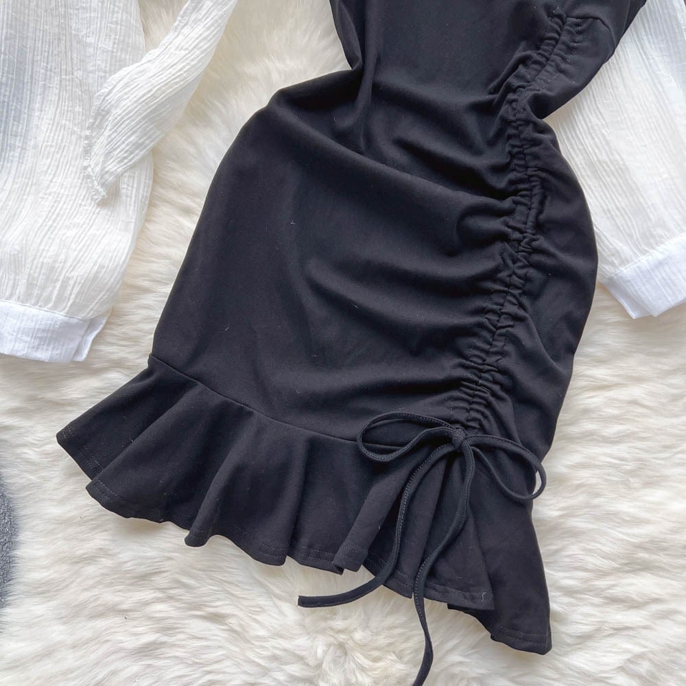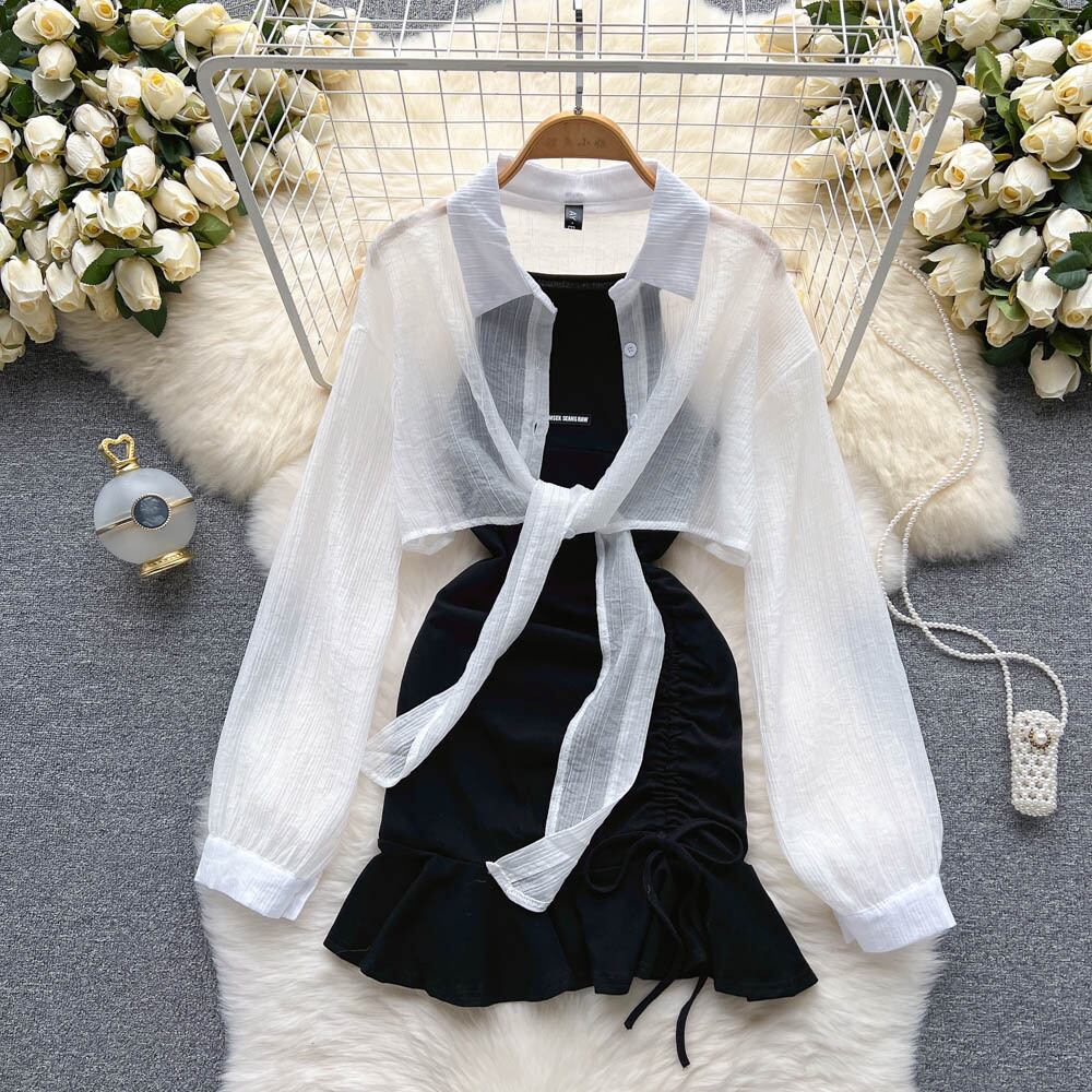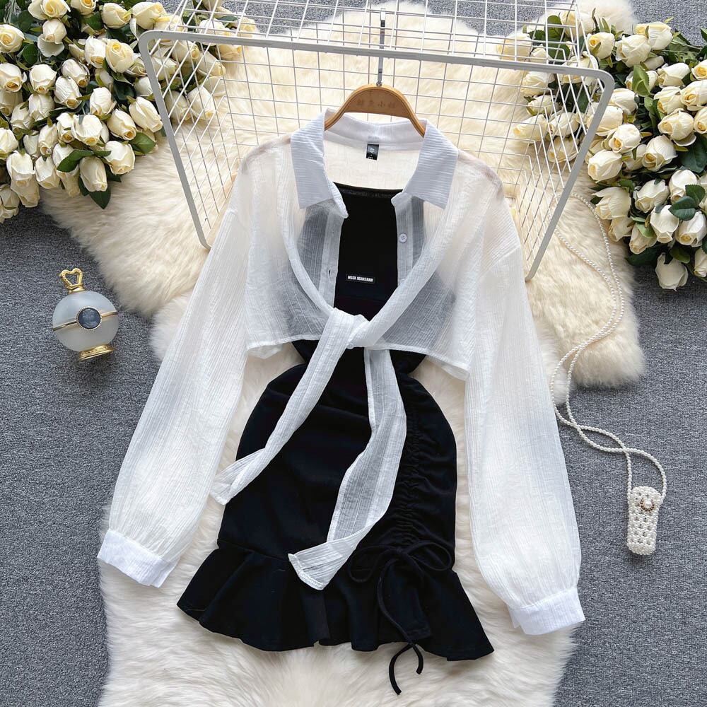 香港スタイルのレトロシックなスーツの女性の純粋な欲望ホットガール黒の巾着ドレス + 白のショートシャツ 2 点セット ホワイト ブラック ピュア lyxaj62588858395