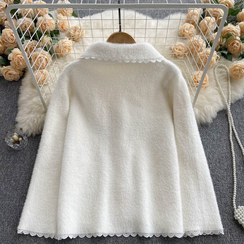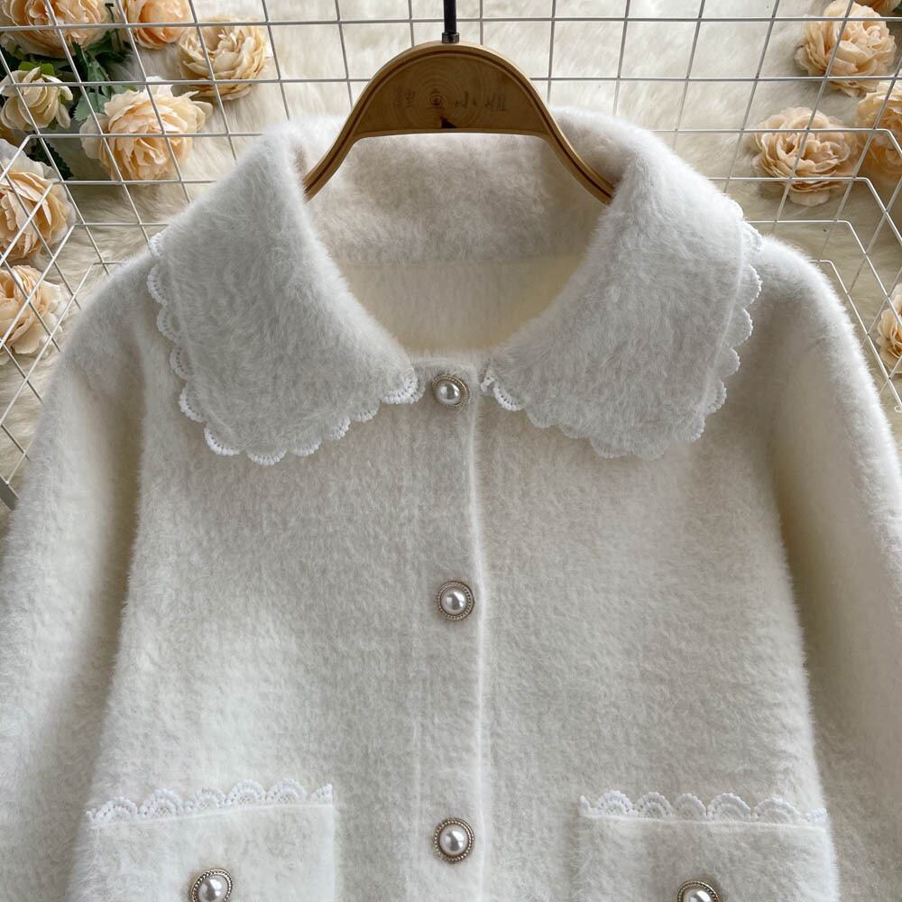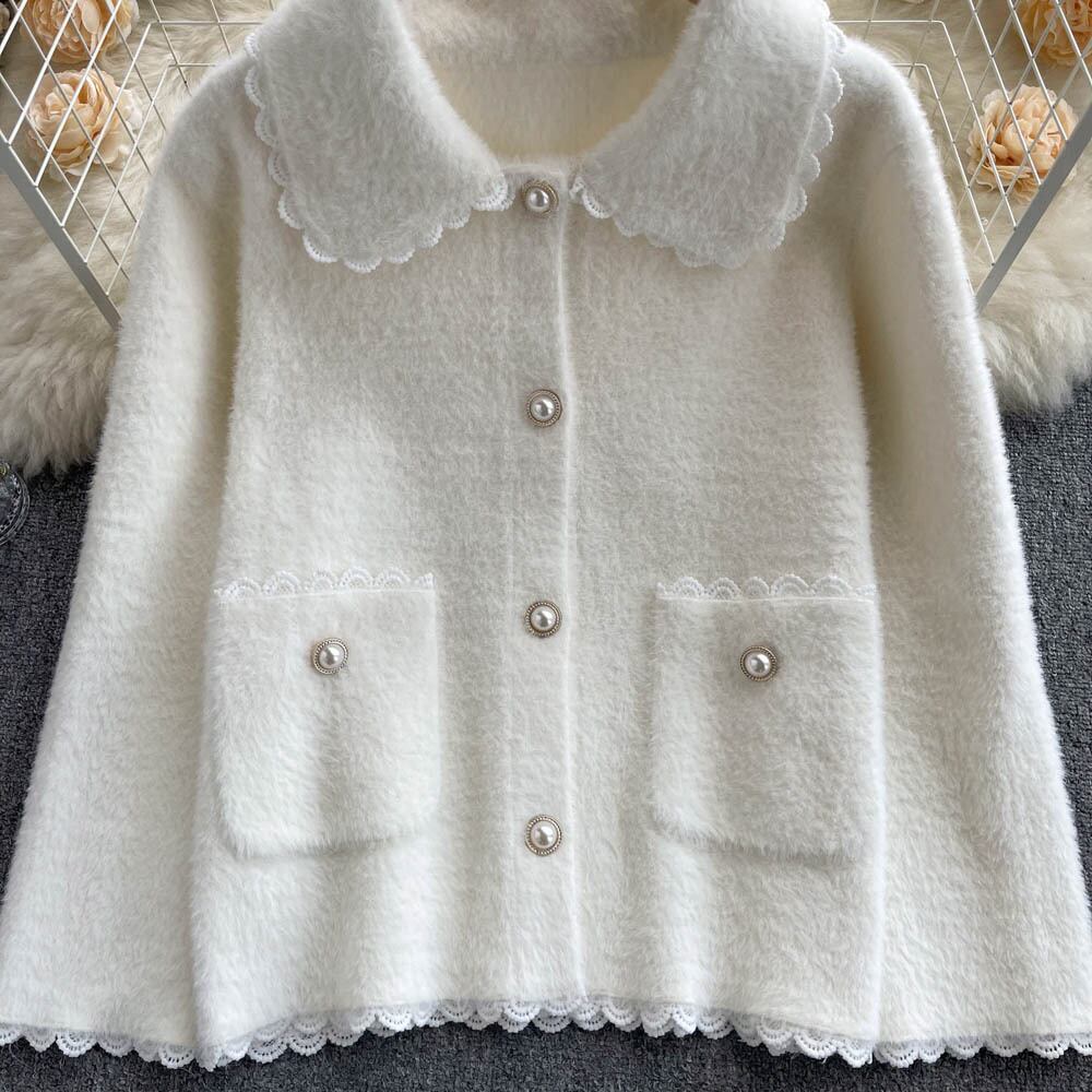 Light familiar style loose all-match doll collar sweater coat women's autumn and winter this year's popular lace edge white long-sleeved top ロング ホワイト レース オータム 秋物 ウィンター 冬物 lyxaj13021499542